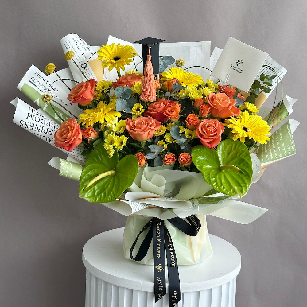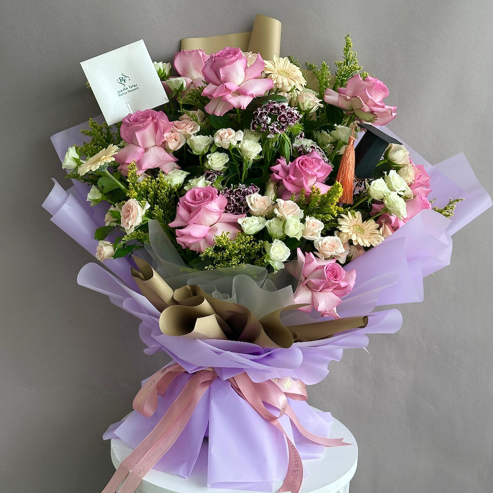 باقة أنيقة تحتوي على 4 أزهار الجيربيرا، 8 جوري، 8 كريز، 2 أنثوريوم، 5 كراسبيديا و 6 ستييل قراس.