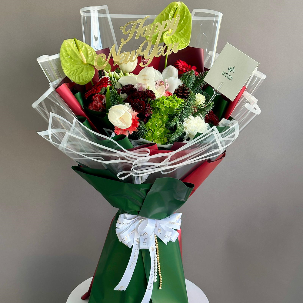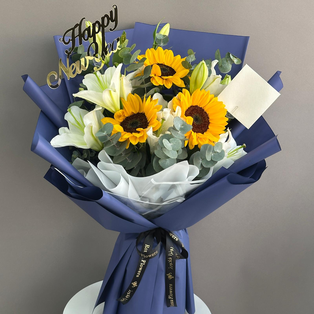 باقة يد تحتوي على دوار الشمس، الليليز واليوكالبتوس.