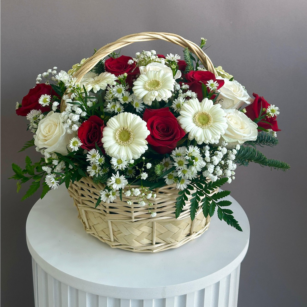 سلة من الخوص المنسوج بعناية، تحتضن تنسيقاً زهرياً يجمع بين الورود الحمراء العاطفية والورود البيضاء النقية، إلى جانب الجربيرا البيضاء وزهور صغيرة مثل جيبسوفيلا، مع لمسات من الأوراق الخضراء التي تضيف حيوية وانسجاماً. التباين بين الأحمر والأبيض يمنح السلة مظهراً مميزاً يجمع بين الرومانسية والصفاء، مما يجعلها هدية مثالية للتعبير عن الحب أو لتزيين المناسبات الخاصة بأسلوب راقٍ ودافئ.