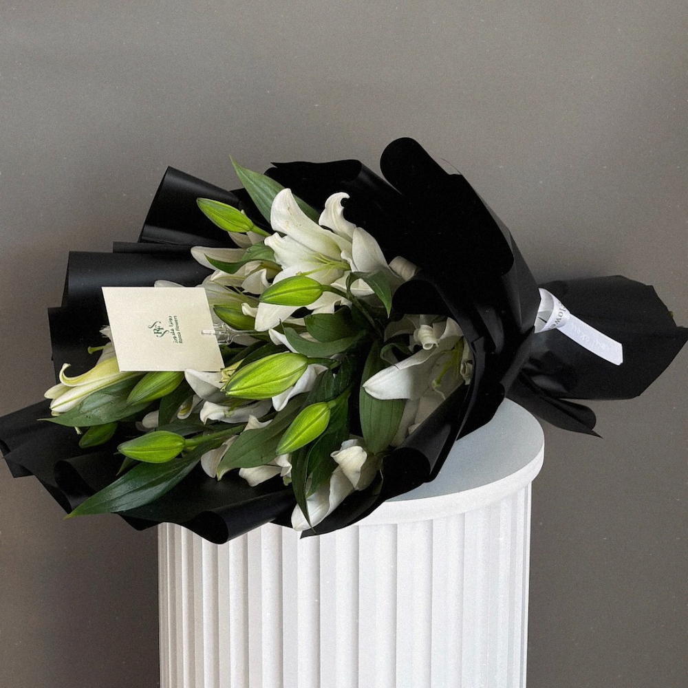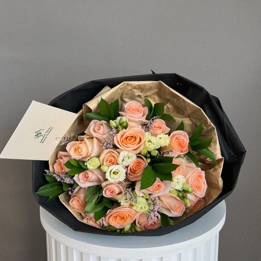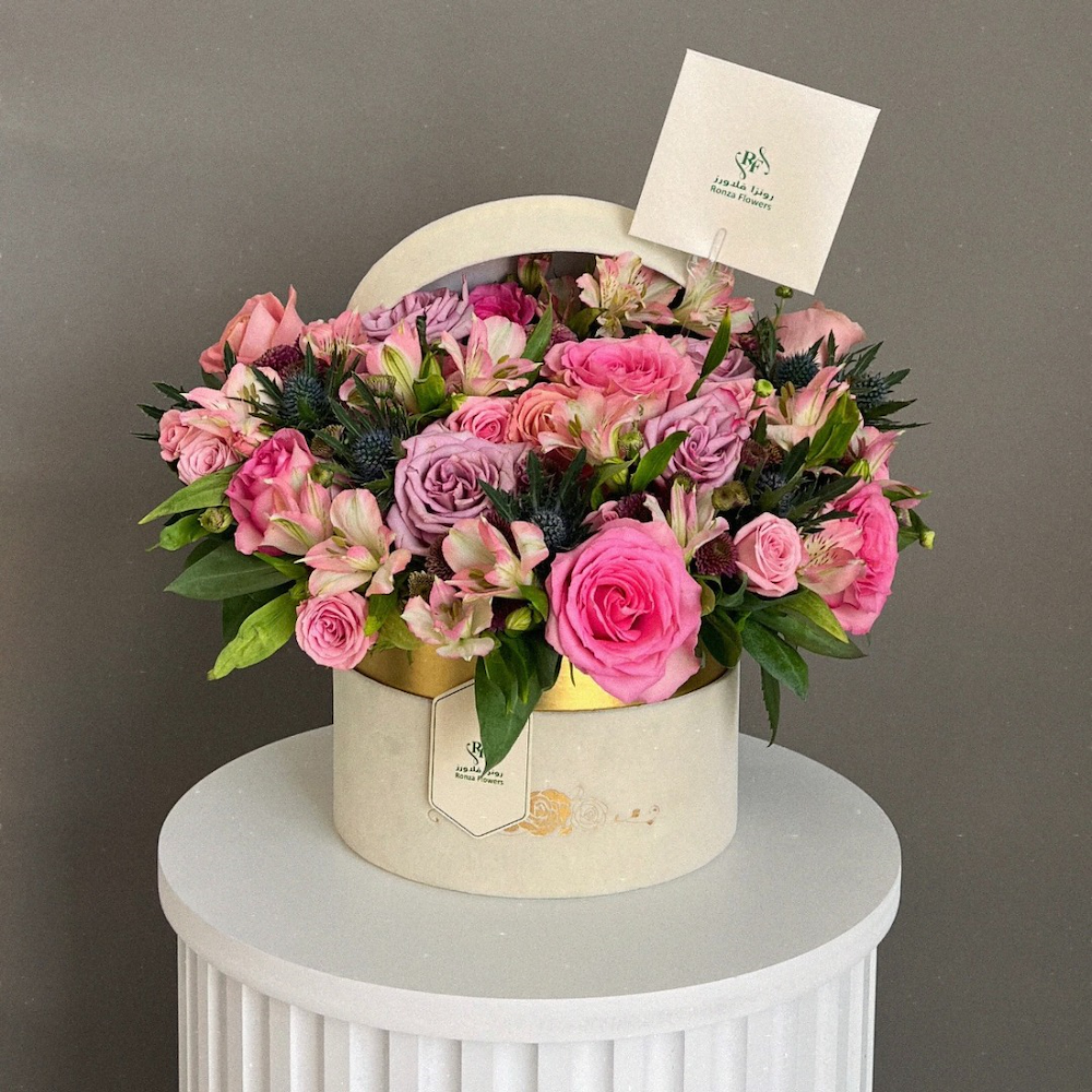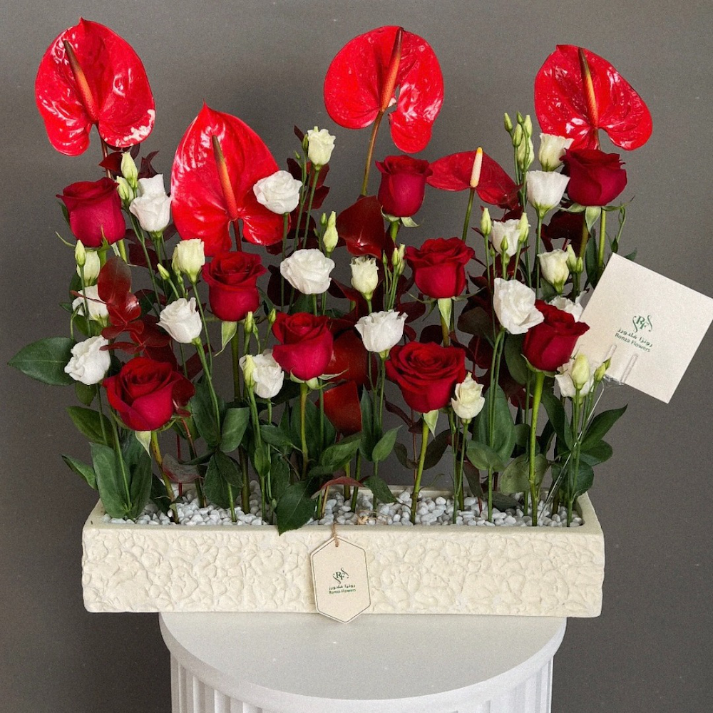 فازة مليئة بأزهار الجوري، الماثيولا، يوستوما والأنثوريوم.