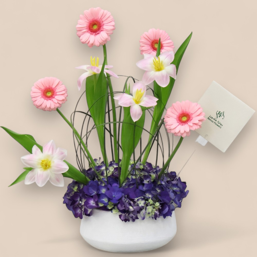 فازة أنيقة مليئة بأزهار الجربيرا، الكوبية والتوليب.