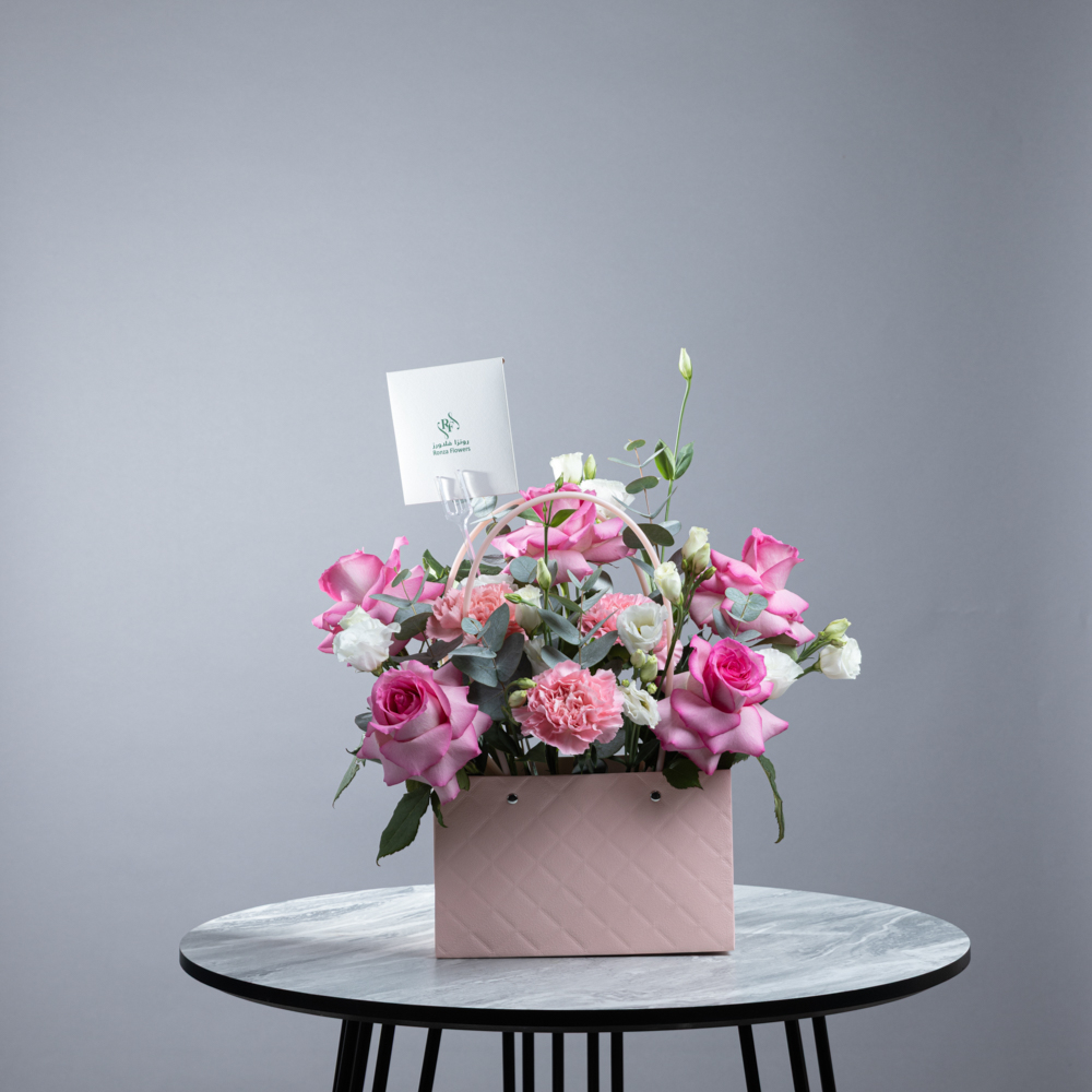 باقة جميلة مليئة بأزهار الجوري، الكارنيشن والليسيانتوس، مع أوراق الأوكالبتوس.