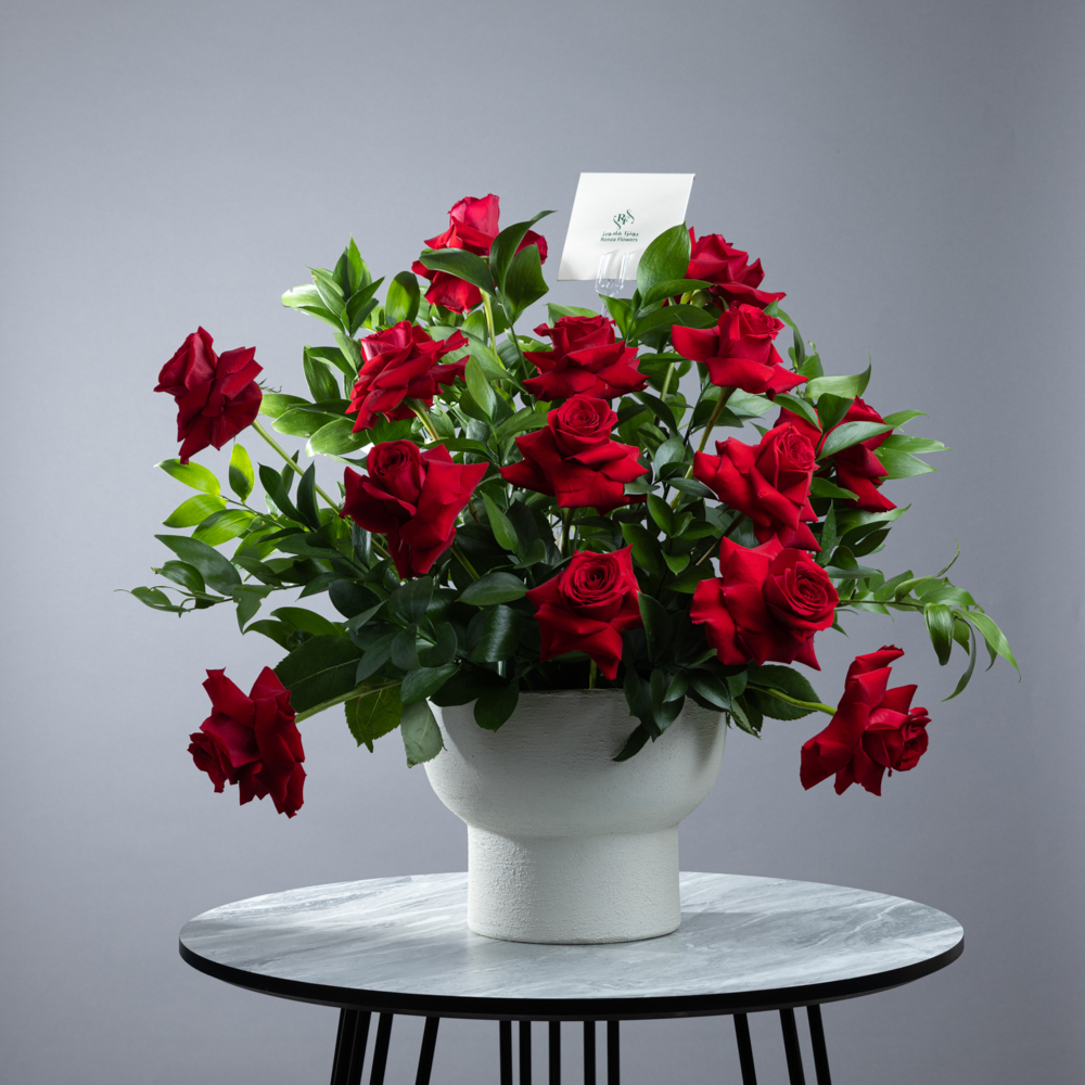 تنسيق رائع من الورود الحمراء الفاخرة، مرتبة بأناقة في مزهرية بيضاء عصرية مع أوراق خضراء طبيعية. تصميم أنيق يرمز إلى الحب والشغف والرومانسية – مثالي للمناسبات الخاصة مثل الذكرى السنوية أو الخطوبة أو للتعبير عن أصدق المشاعر.