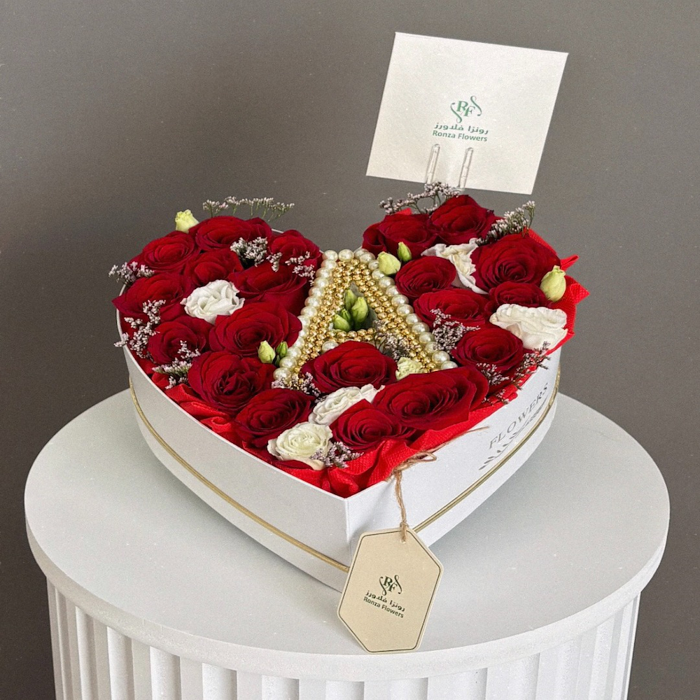 تنسيق فاخر بشكل قلب يضم ورودًا حمراء فخمة مع لمسات من الورود البيضاء، ويتوسطه حرف A مزين باللؤلؤ ليمنح التصميم لمسة شخصية راقية. يأتي في علبة بيضاء فاخرة، ليجسّد الحب والأناقة ويعد هدية مثالية لشخص مميز.