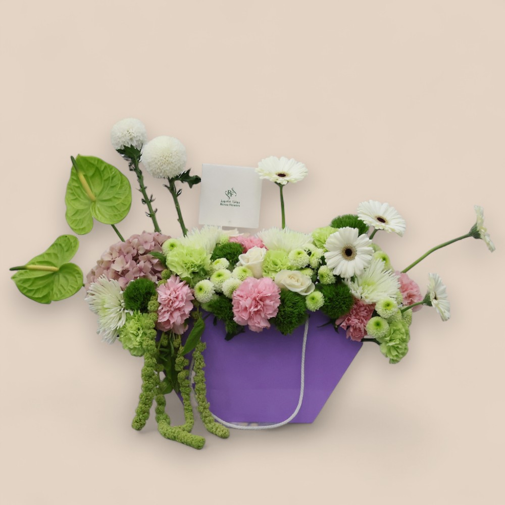 باقة أنيقة مليئة بأزهار الكوبية، الكارنيشن والجربيرا.
