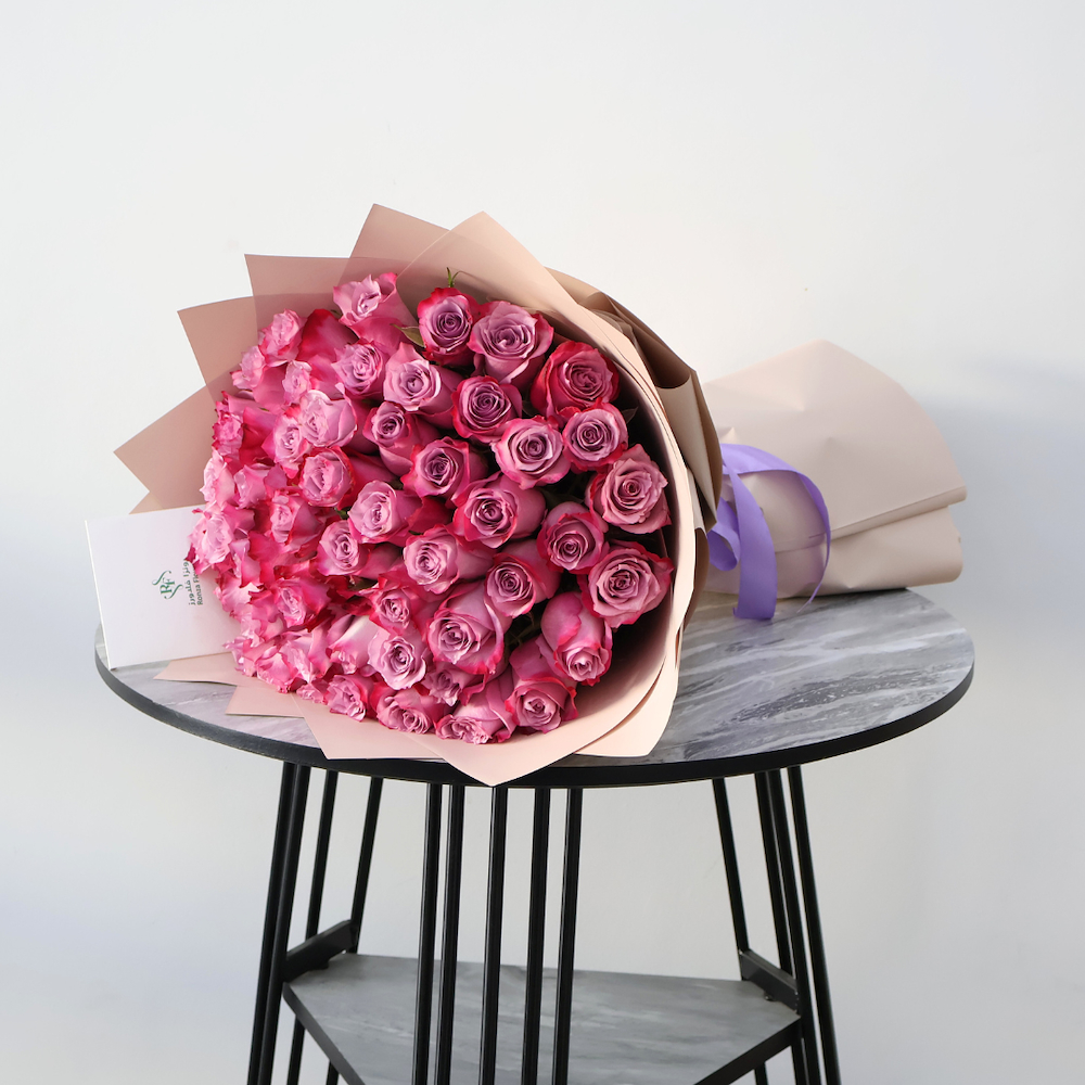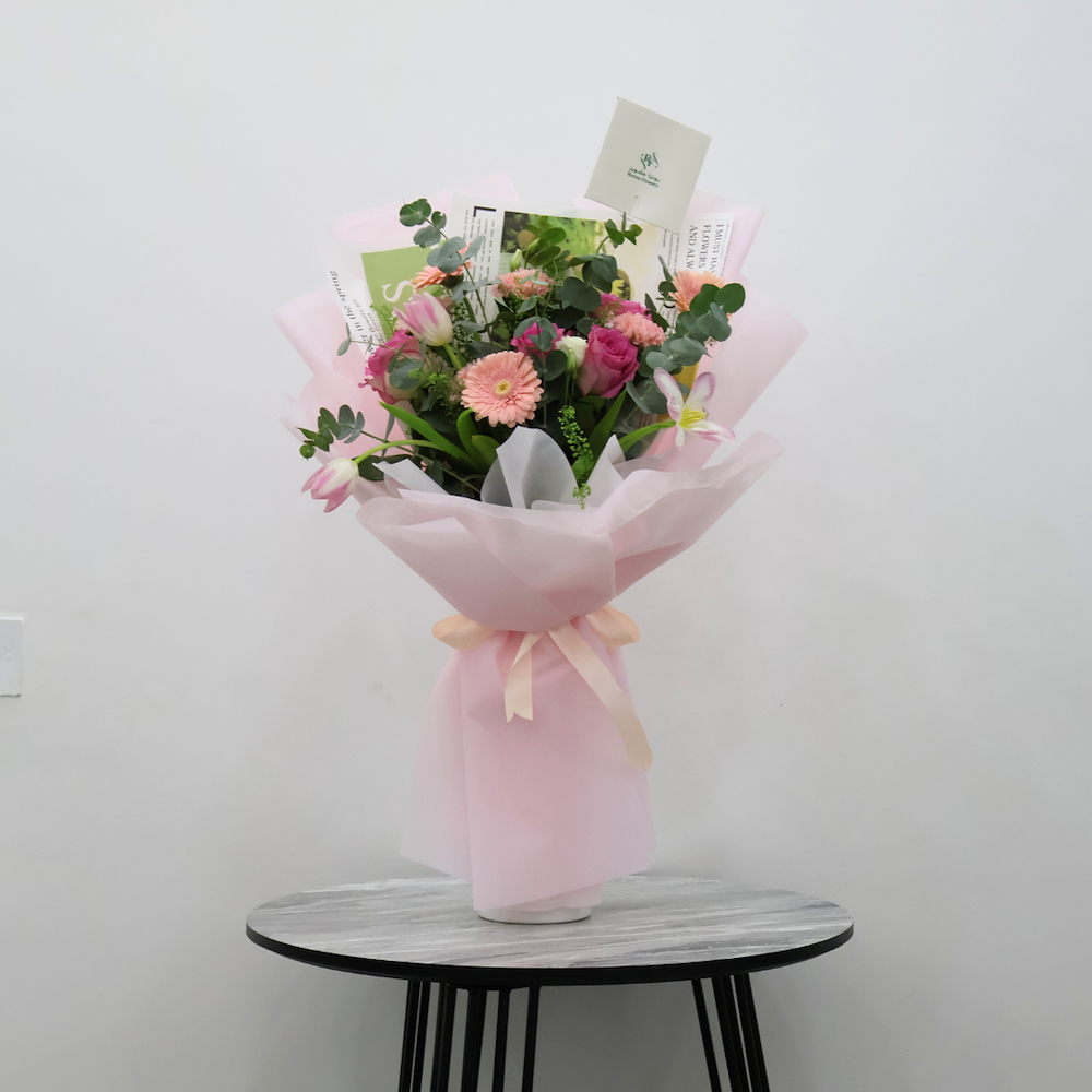 باقة تحتوي على الجوري، الكارنيشن، الجيربيرا والتوليب.