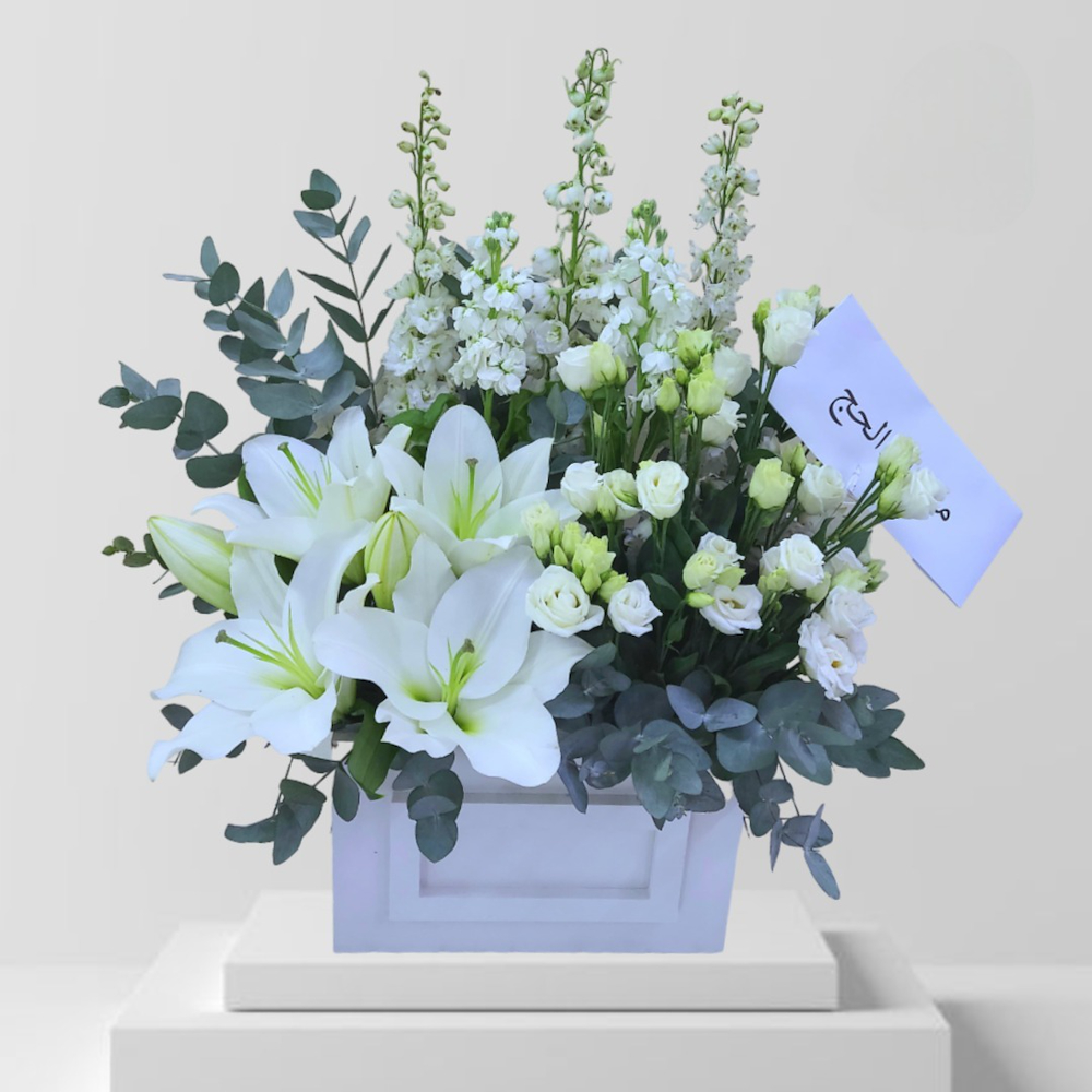 تنسيقات صناديق خشبية جميلة من الزنبق الأبيض والميثولا الأبيض والدلفينيوم الأبيض والأوستوما البيضاء والأوكليبتوس.