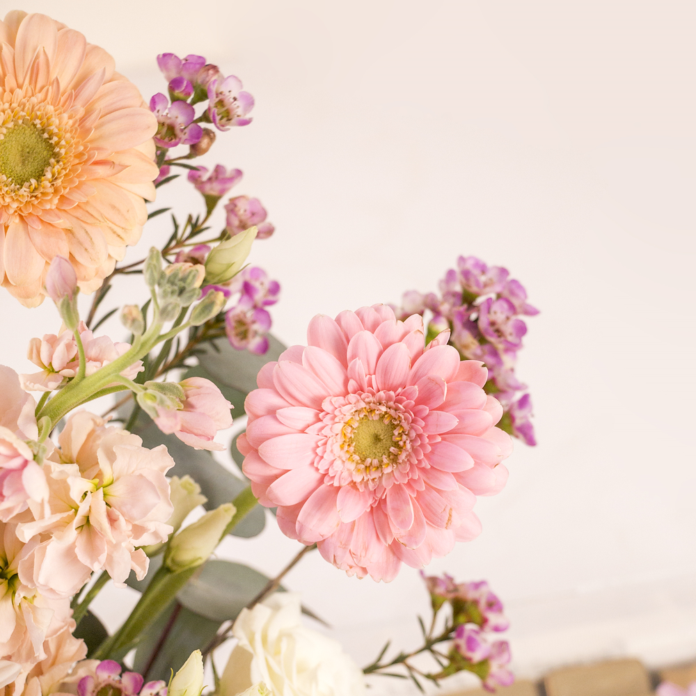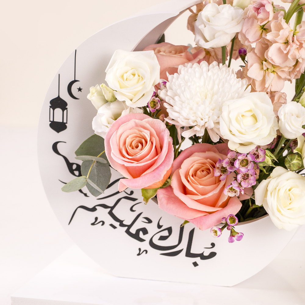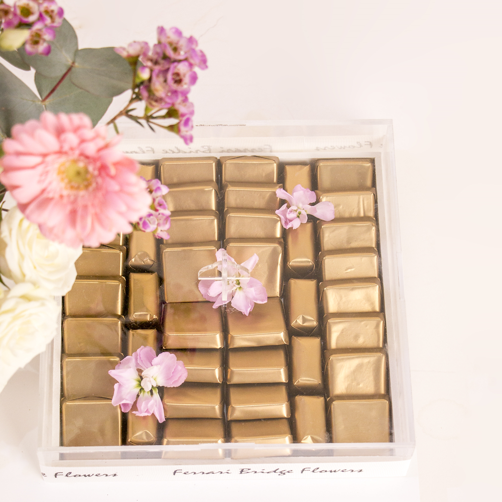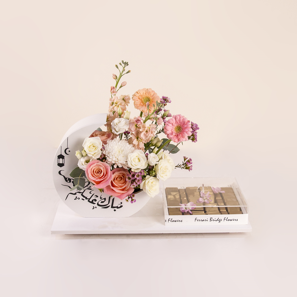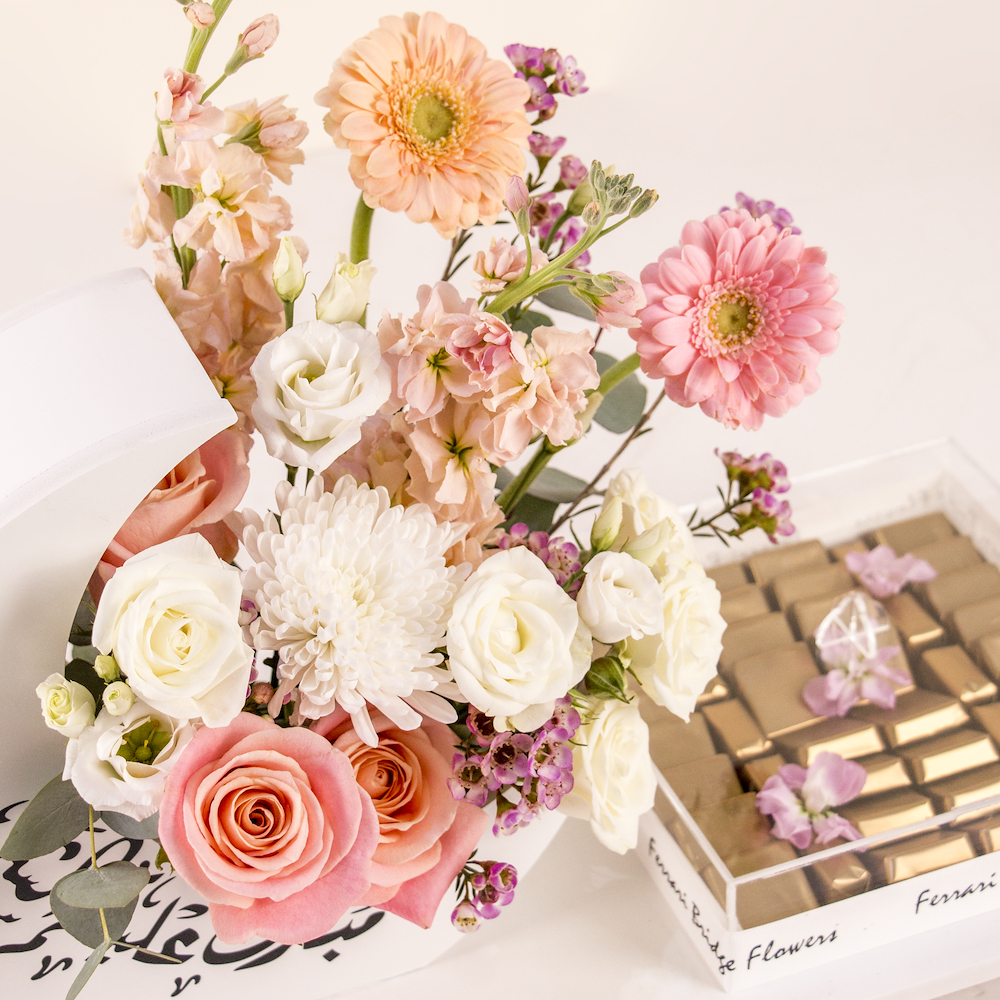 صينية أنيقة مليئة بأزهار الجوري، الجربيرا والكريز مع بوكس من الشوكولاتة الفاخرة المغلفة.