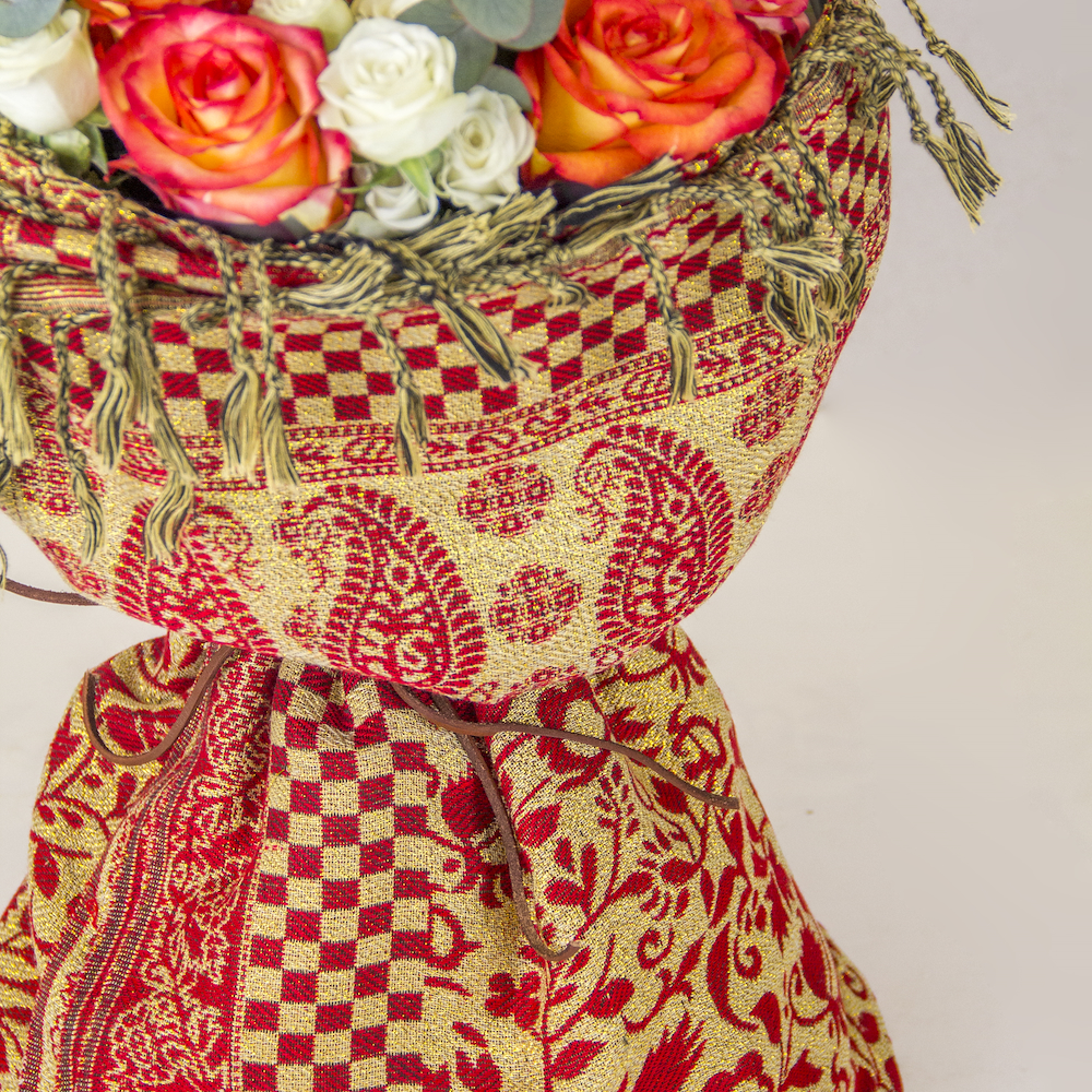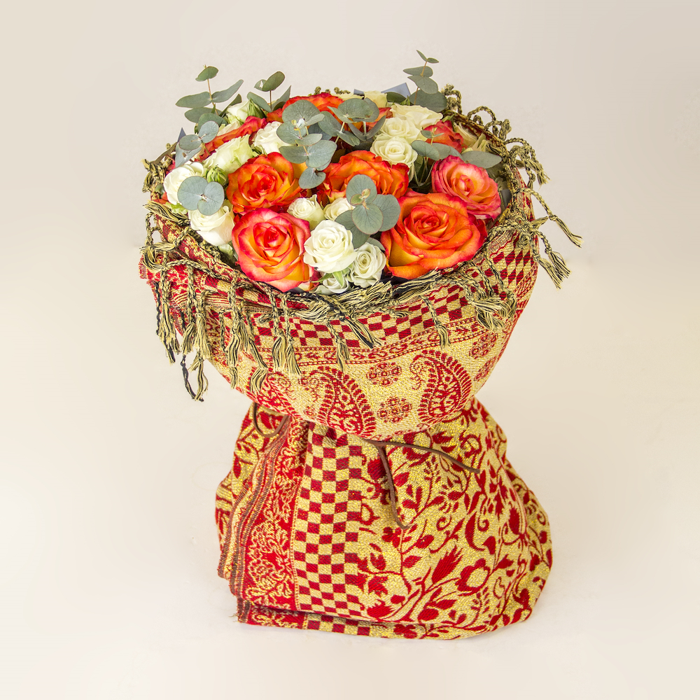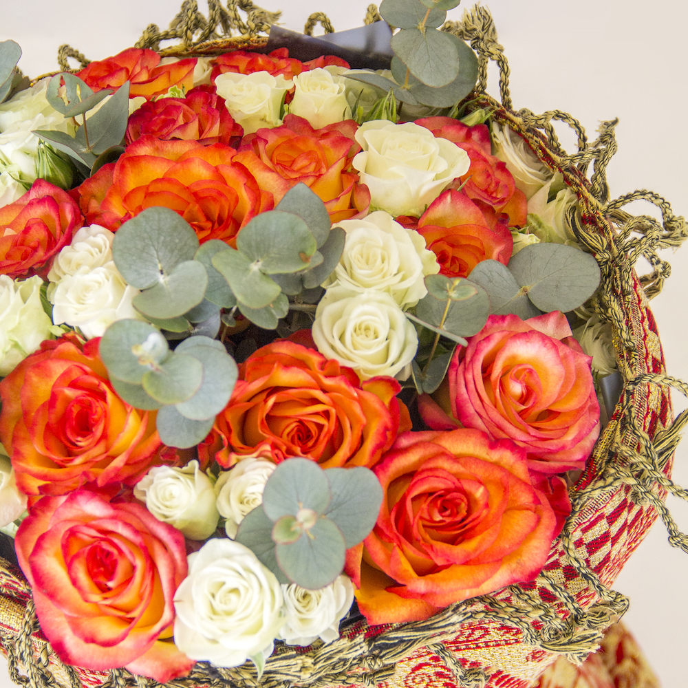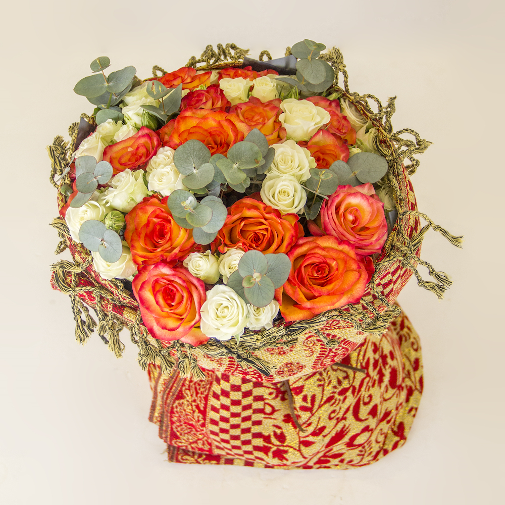 احتفل بأناقة مع هذه الباقة الاحتفالية المبهجة من زهور الجوري البرتقالية والبيضاء، المزينة برائحة الأوكالبتوس العطرية والمغلفة بقماش منقوش نابض بالحياة. إنها طريقة مثالية لإضفاء البهجة على يوم شخص ما.