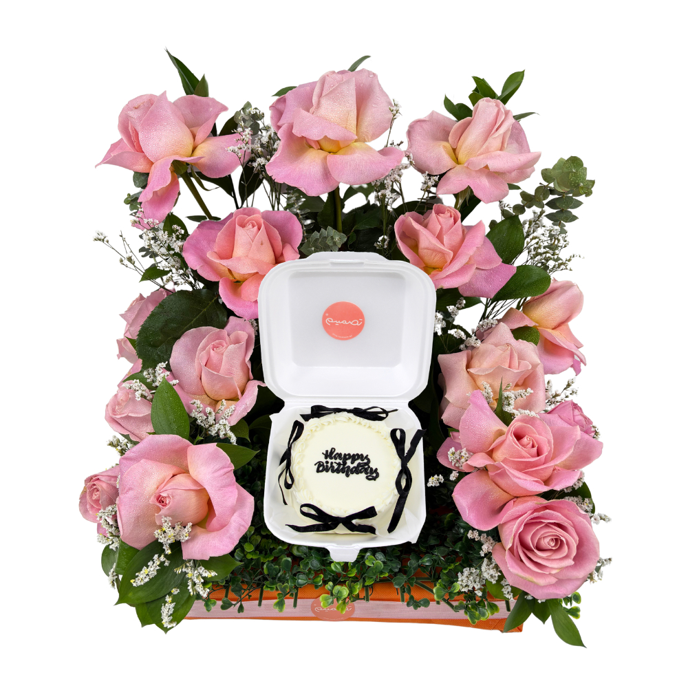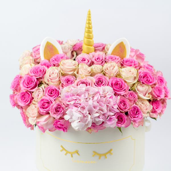 هذة الباقة تحتوي على زهور الجوري في صندوق هديه اليونيكورن.