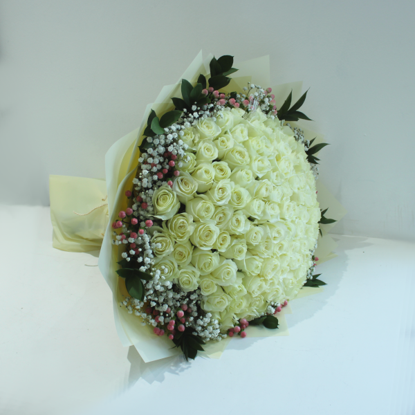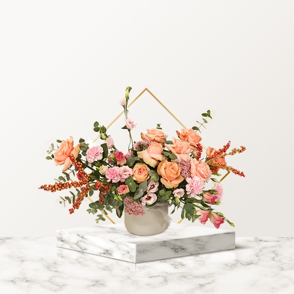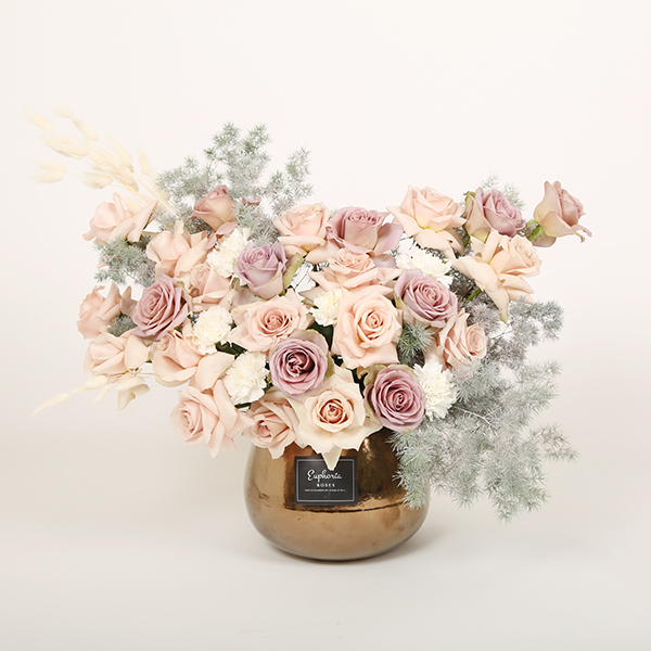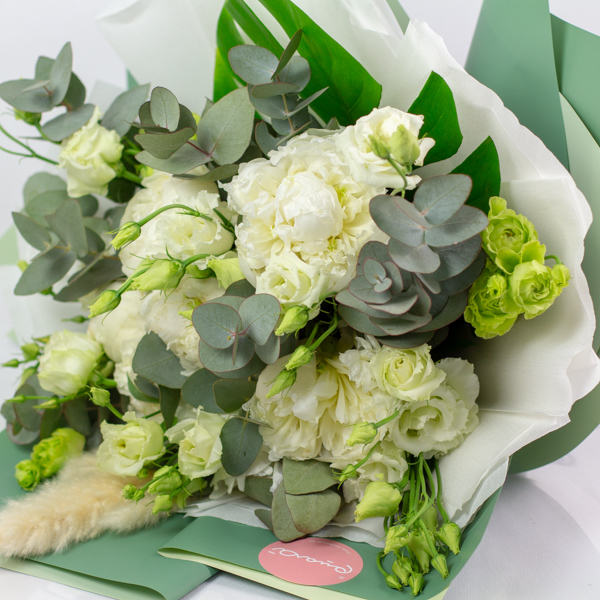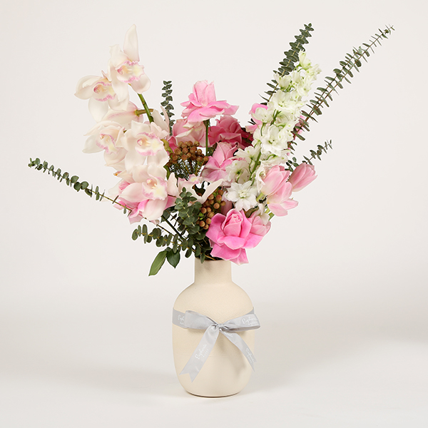 يحتوي هذا الترتيب على زهور مختلطة مع أوراق مرتبة في غلاف أزهار باستيل.