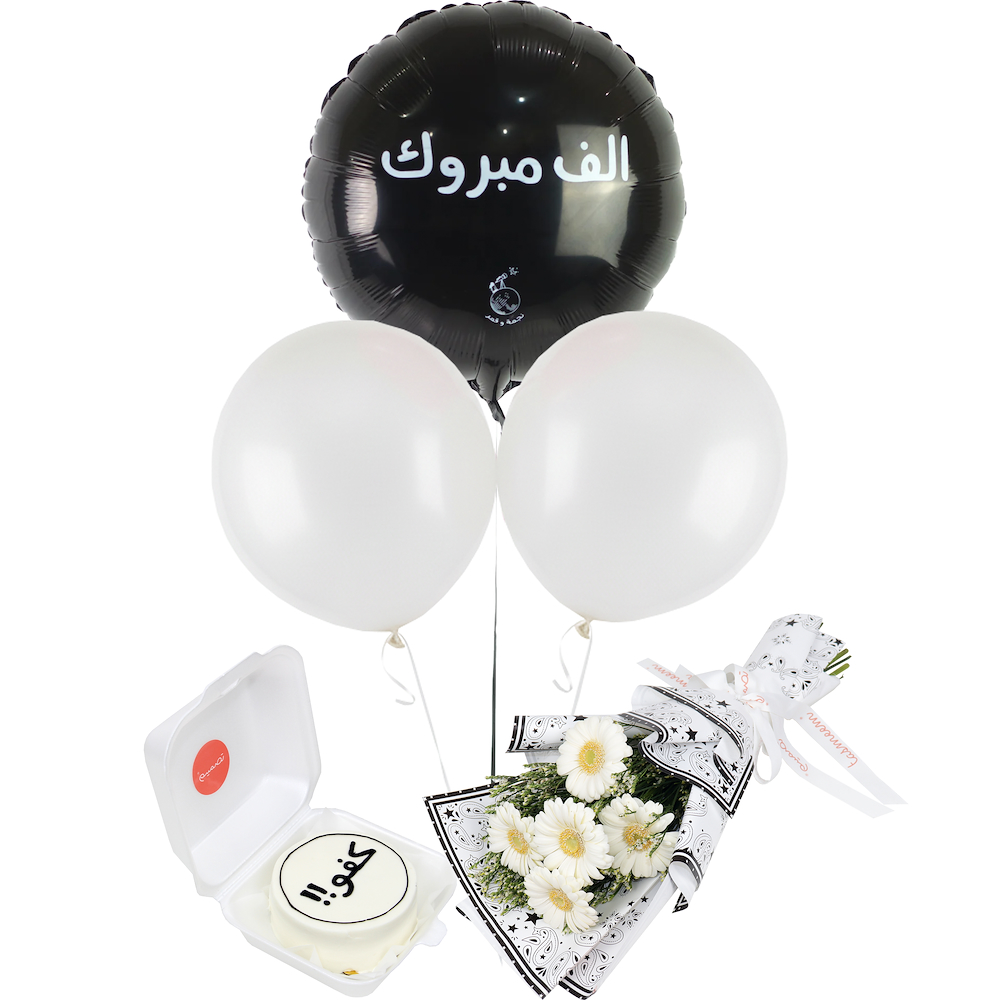 مجموعة تحتوي على كيكة صغيرة مع باقة من زهور الجيربيرا البيضاء، وبالونات باللونين الأسود والأبيض.