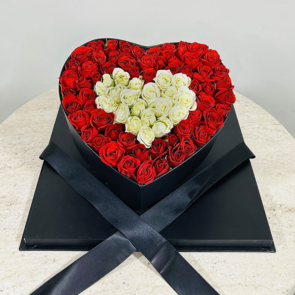 تأتي هذه الهدية الرومانسية بتنسيق أنيق من البيبي جوري الأحمر والأبيض، مرتبة على شكل قلب، ومقدمة داخل صندوق شفاف.