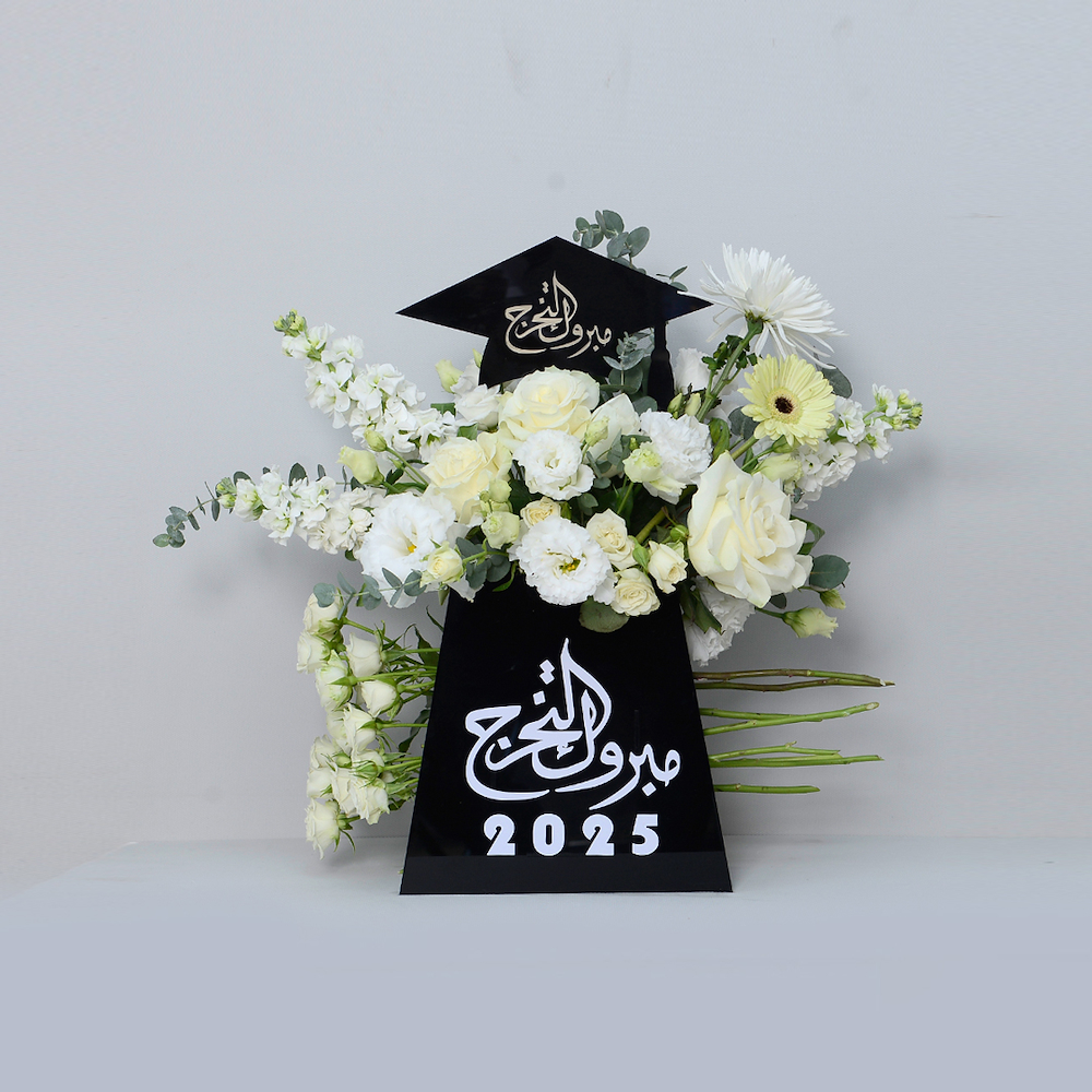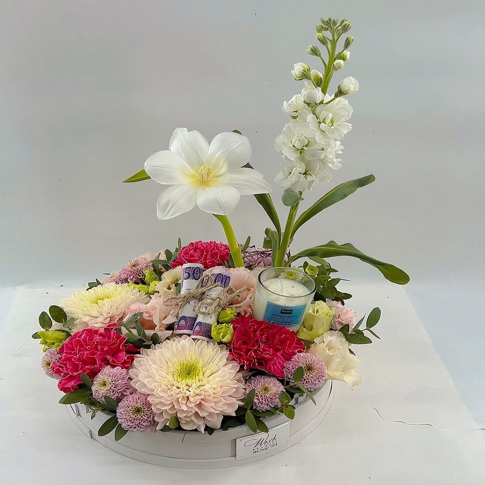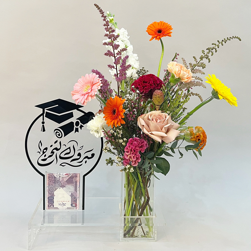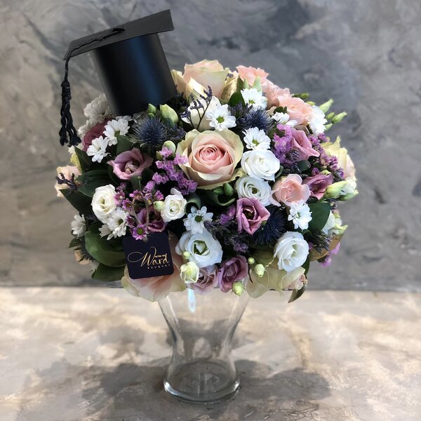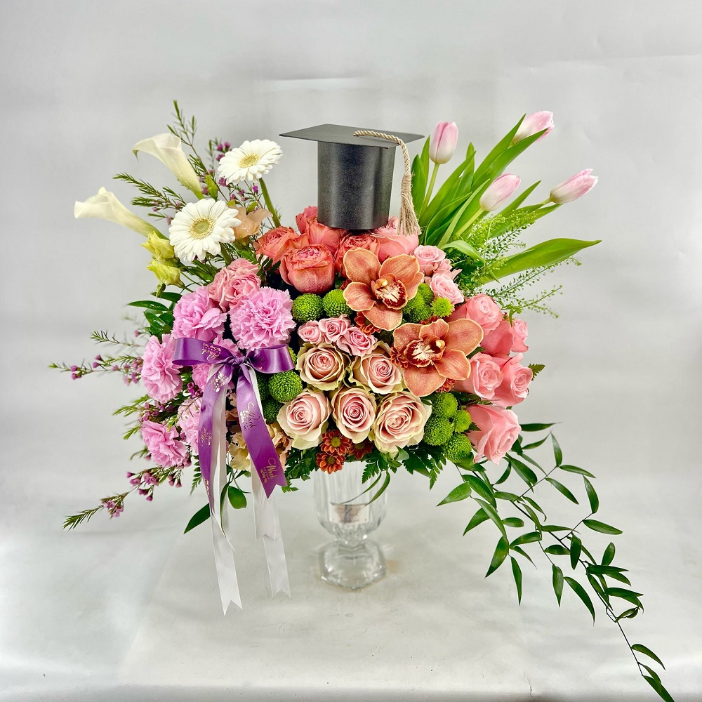 باقة تحتوي على زهور الجوري، الجيربيرا، الكريز، الكارنيشن، الأوركيد، الكالا ليلي والتوليب مرتبة بشكل جميل في فازة.