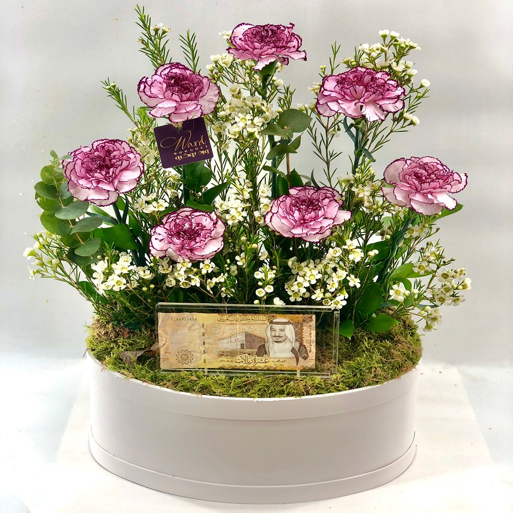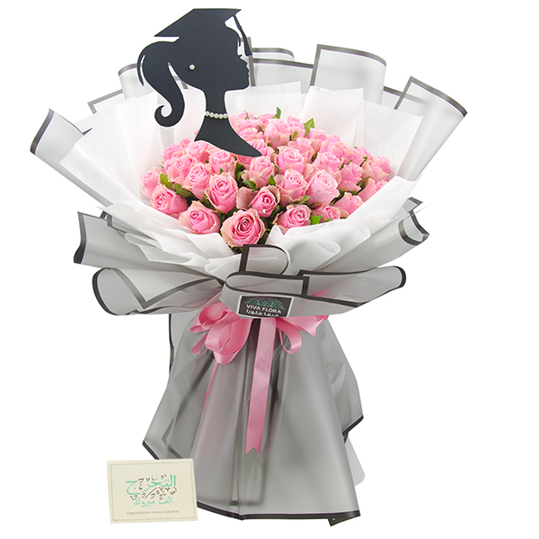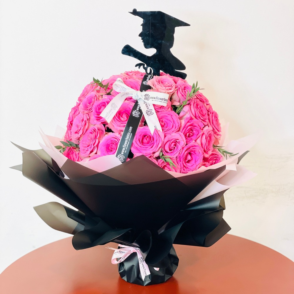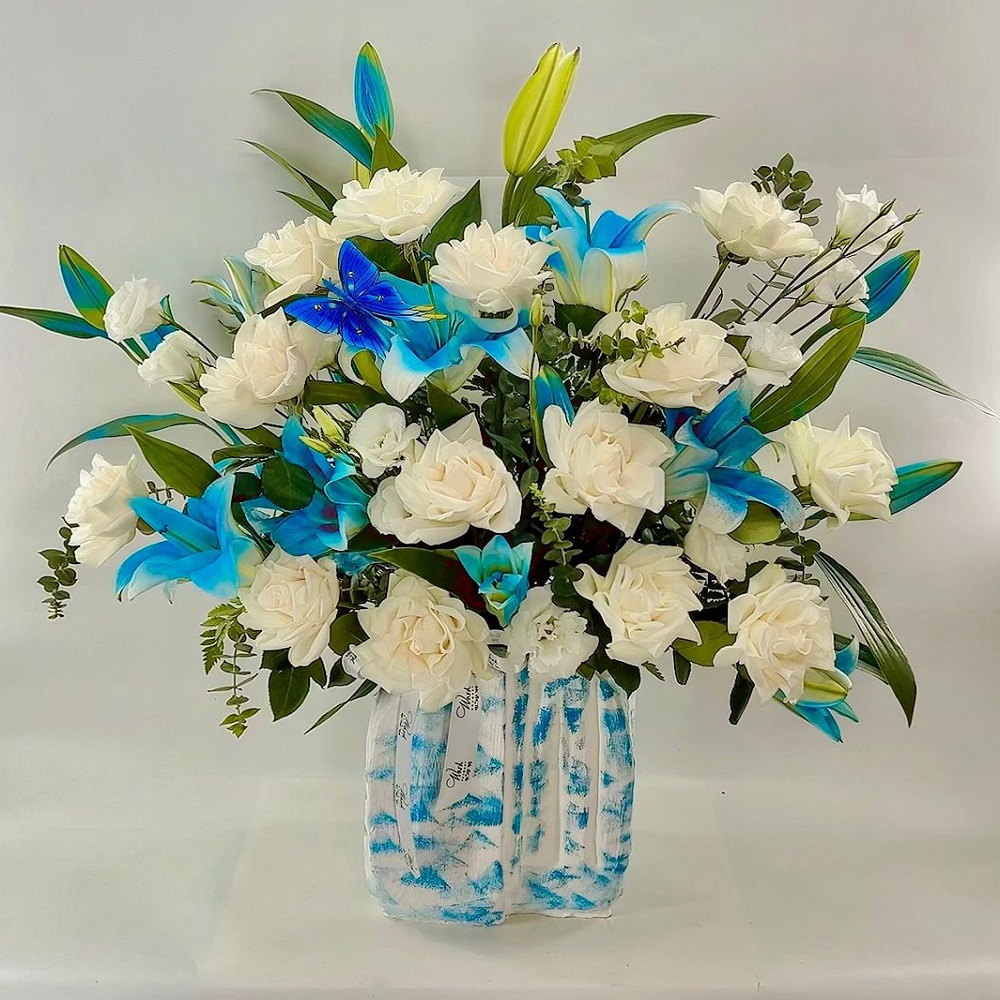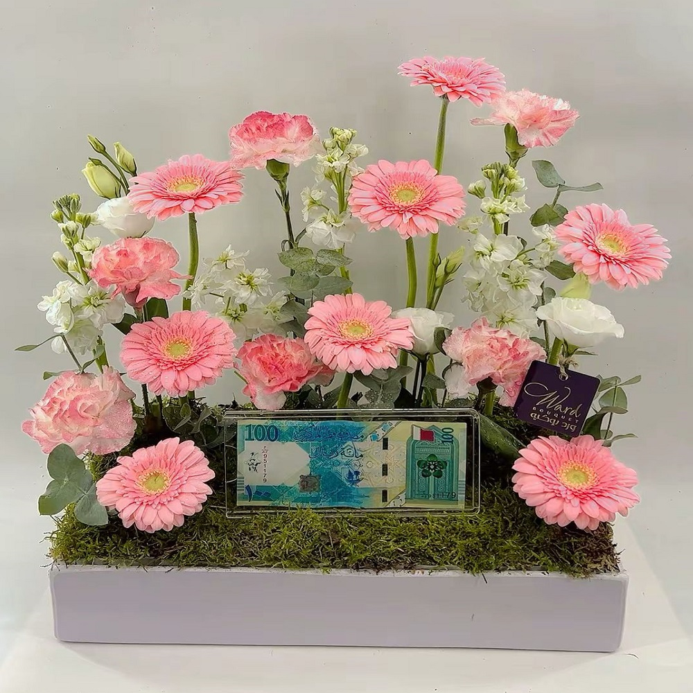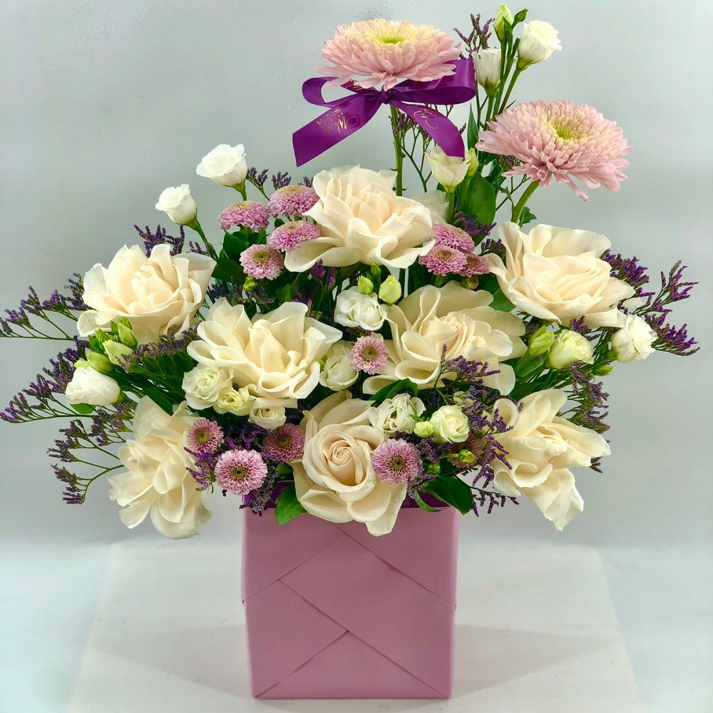 باقة تحتوي على زهور الجوري، الجيربيرا، الكريز، الكارنيشن، الأوركيد، الكالا ليلي والتوليب مرتبة بشكل جميل في فازة.