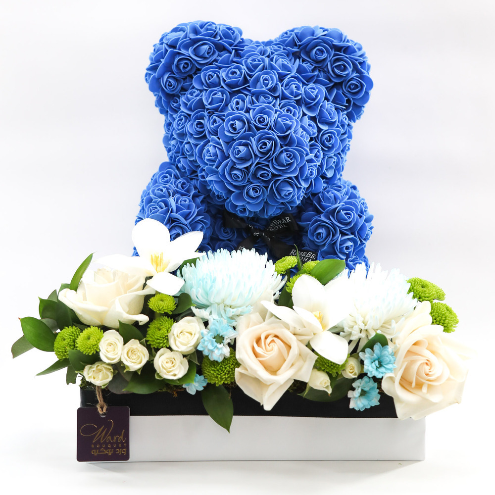 باقة تحتوي على الجوري، والتوليب مع دمية الدب.