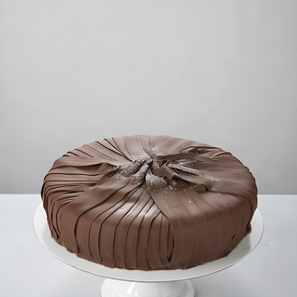 كيكة اسفنجية بنية محشية بكريمة الكاكاو، ومغطاة بكريمة منتصف الليل الشهيرة، ومزينة بمبشور الشوكولاتة ورشة خفيفة من السكر البودرة.