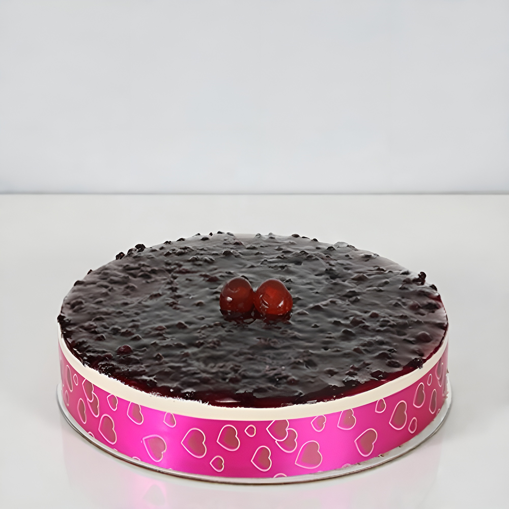 تشيزكيك فانيلا مفترشة على قشرة بسكويت مبشور، ومغطاة بكريمة التوت البري باللون الأزرق، بحجم 15 دائري تكفي 12 إلى 15 شخص.