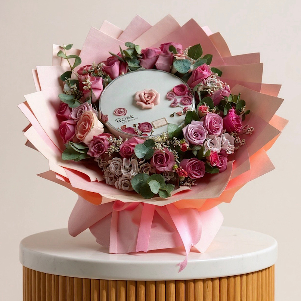 باقة فاخرة مليئة بأزهار الجوري وشوكولاتة بستاني.