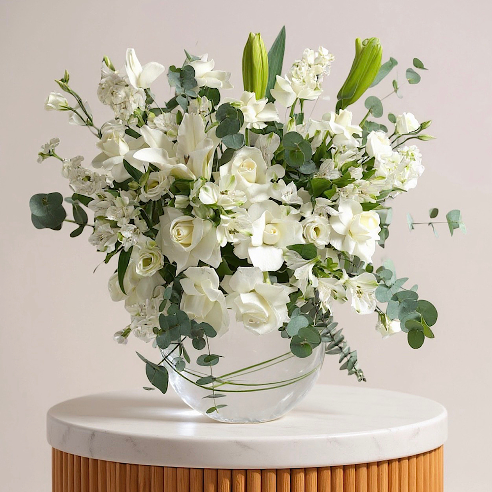فازة مليئة بأزهار الجوري والسترومريا.