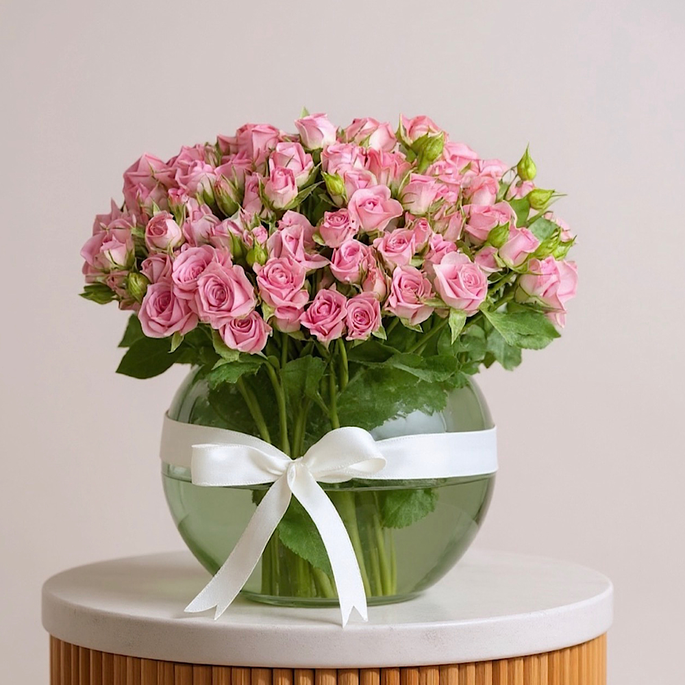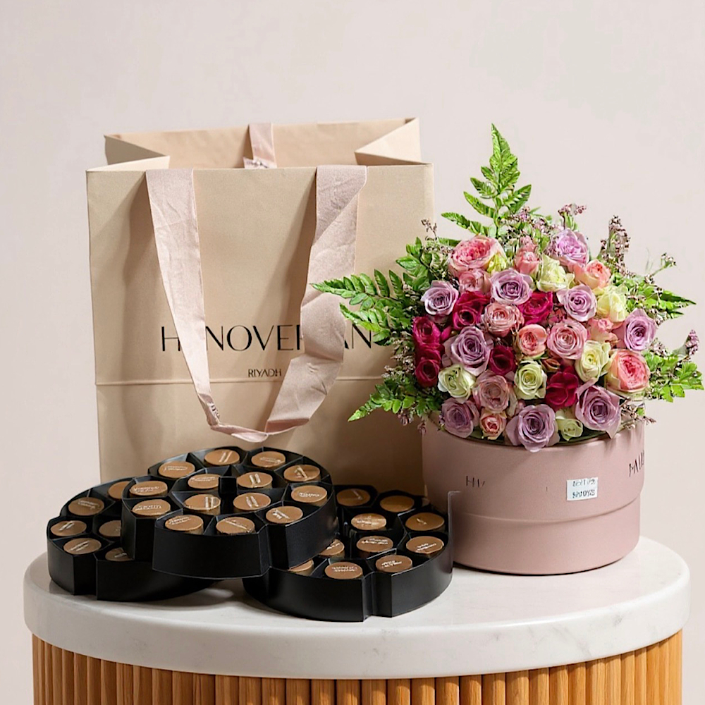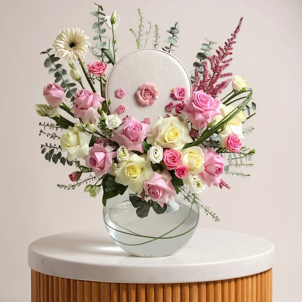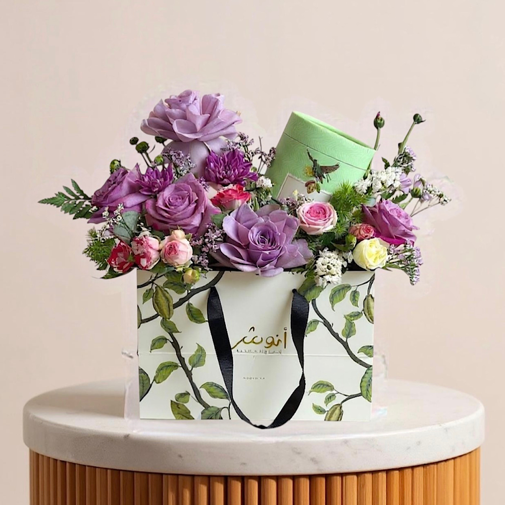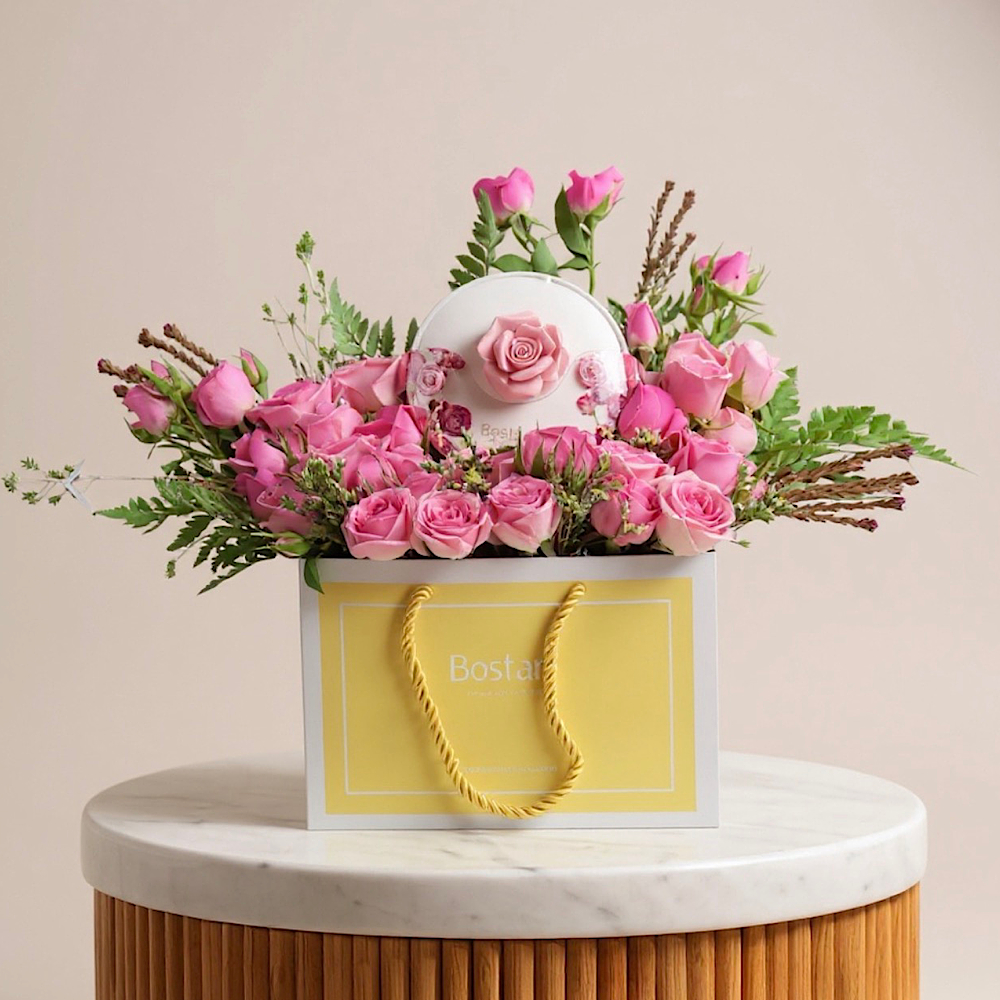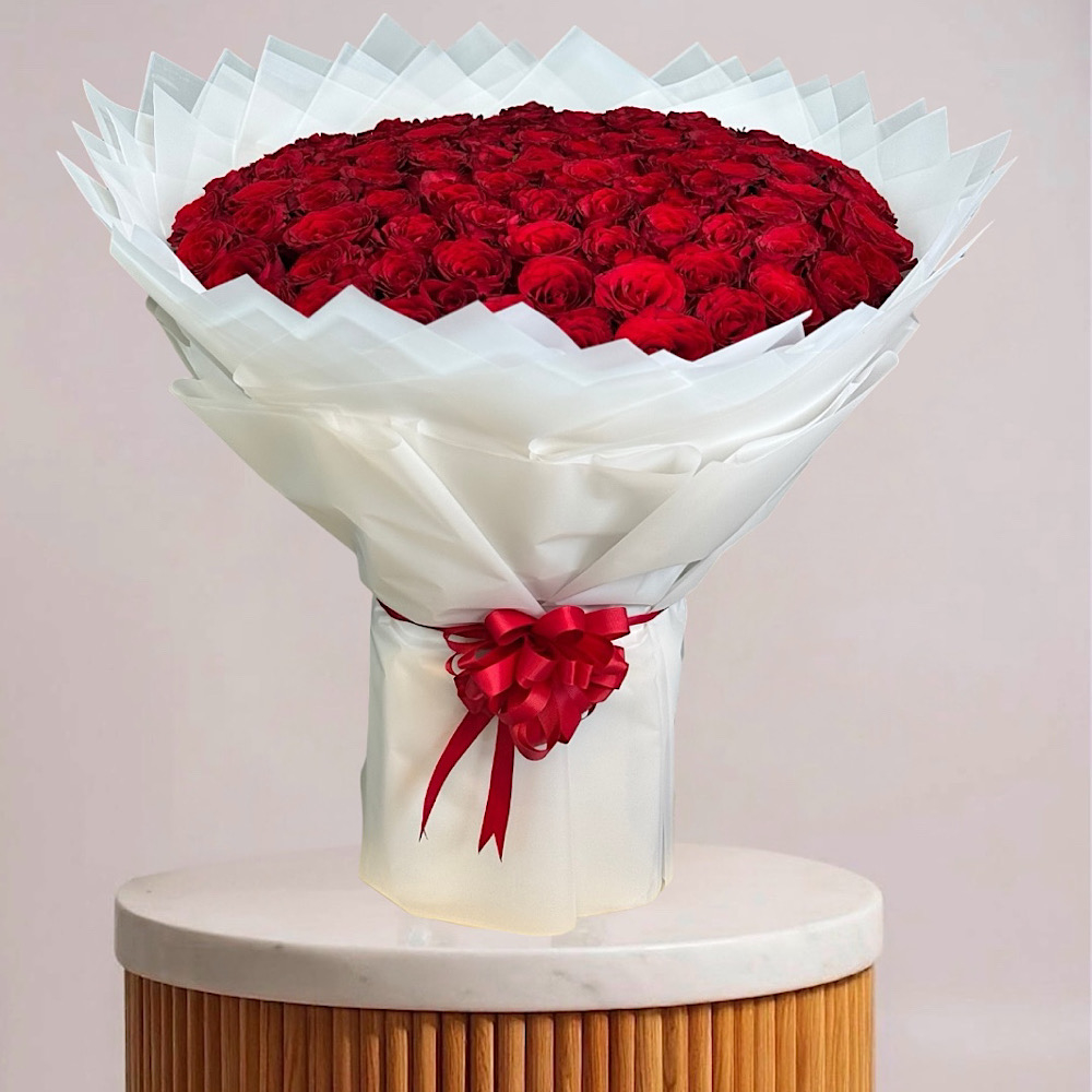 باقة تتميز بأزهار الجوري باللون الأحمر مع تغليف مميز.