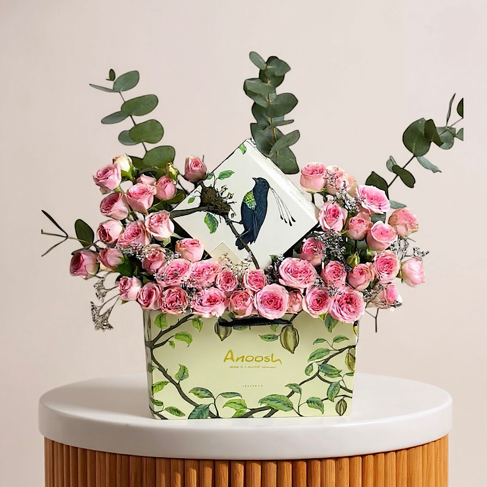 حقيبة أنيقة مليئة بأزهار الجوري وشوكولاتة انوش.