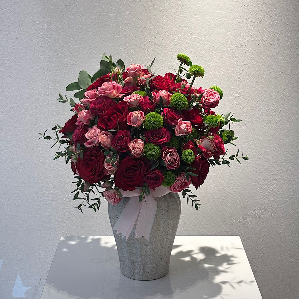 باقة تحتوي على زهور الجوري، البيبي جوري والكريز، مرتبة بشكل جميل في فازة.
