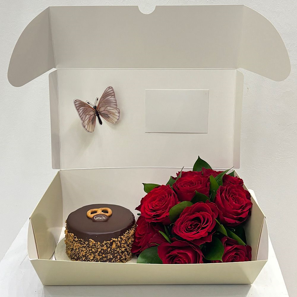 باقة تتميز بأزهار الجوري باللون الأحمر مع كيكة الشوكولاتة والبريتزل.