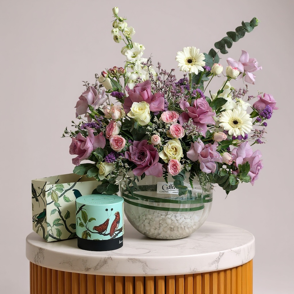 باقة تحتوي على الجوري، البيبي جوري، الجيربيرا، الدلفينيوم واليوكالبتوس مع كيكة من جاناش.
