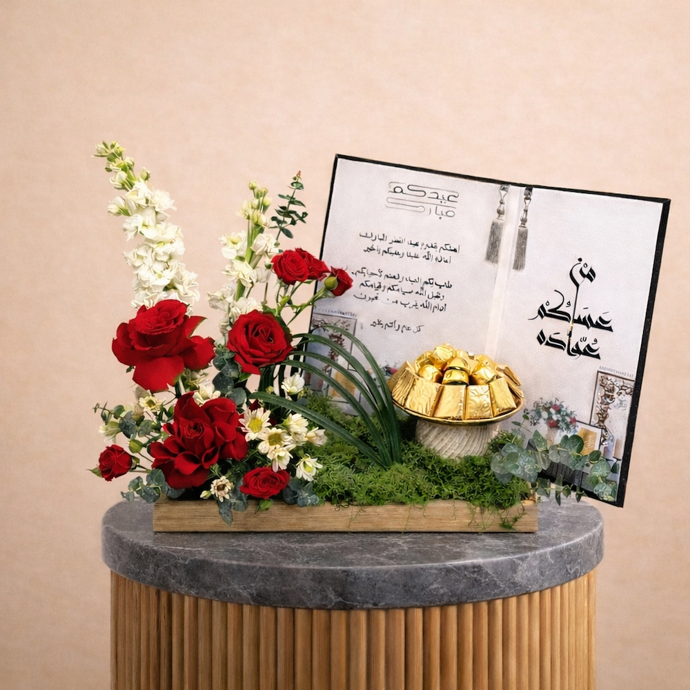 باقة تحتوي على زهور الجوري، الدلفينيوم والكريز مع الشوكولاتة وكتاب العيد.