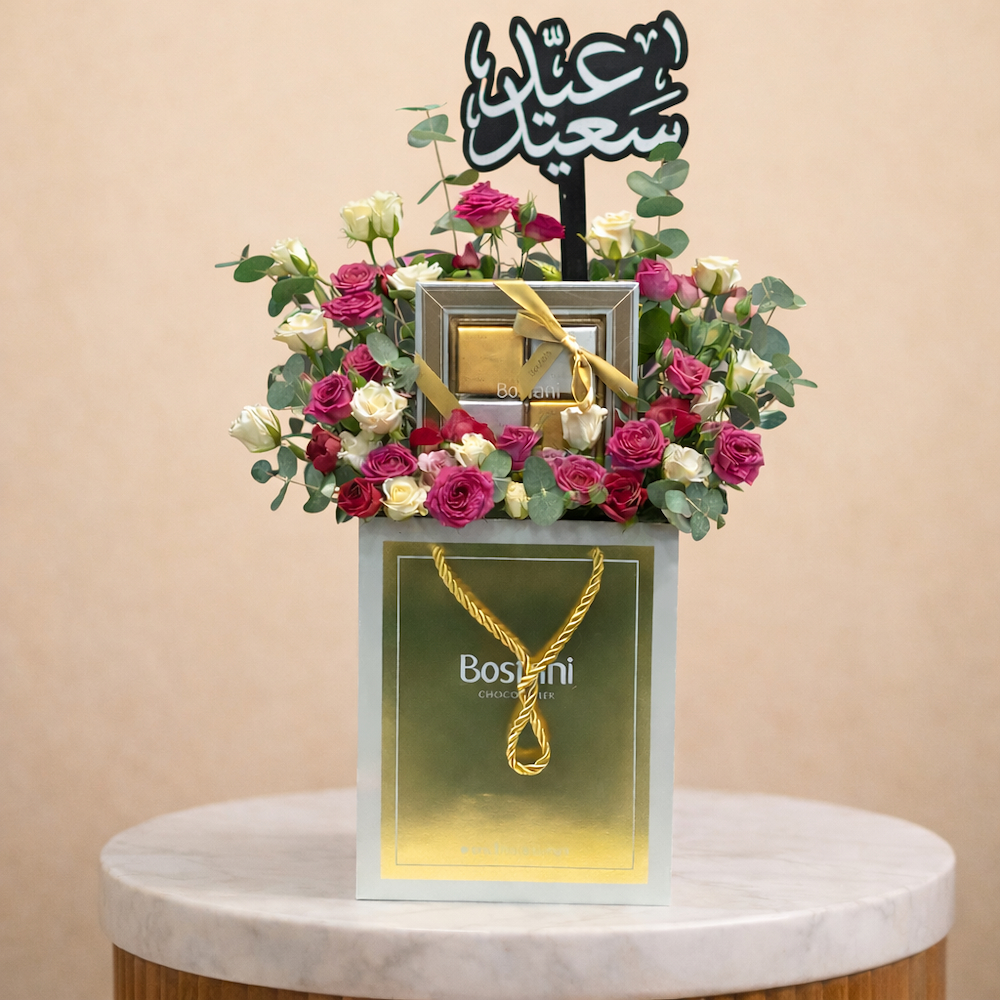 باقة تحتوي على زهور الجوري والبيبي جوري مع شوكولاتة بستاني.