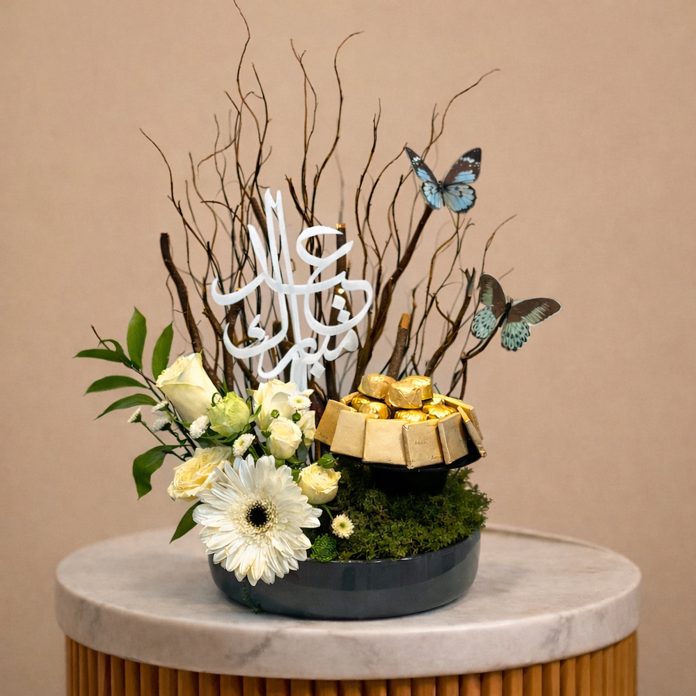 فازة تحتوي على الجوري والبيبي جوري مع الشوكولاتة.