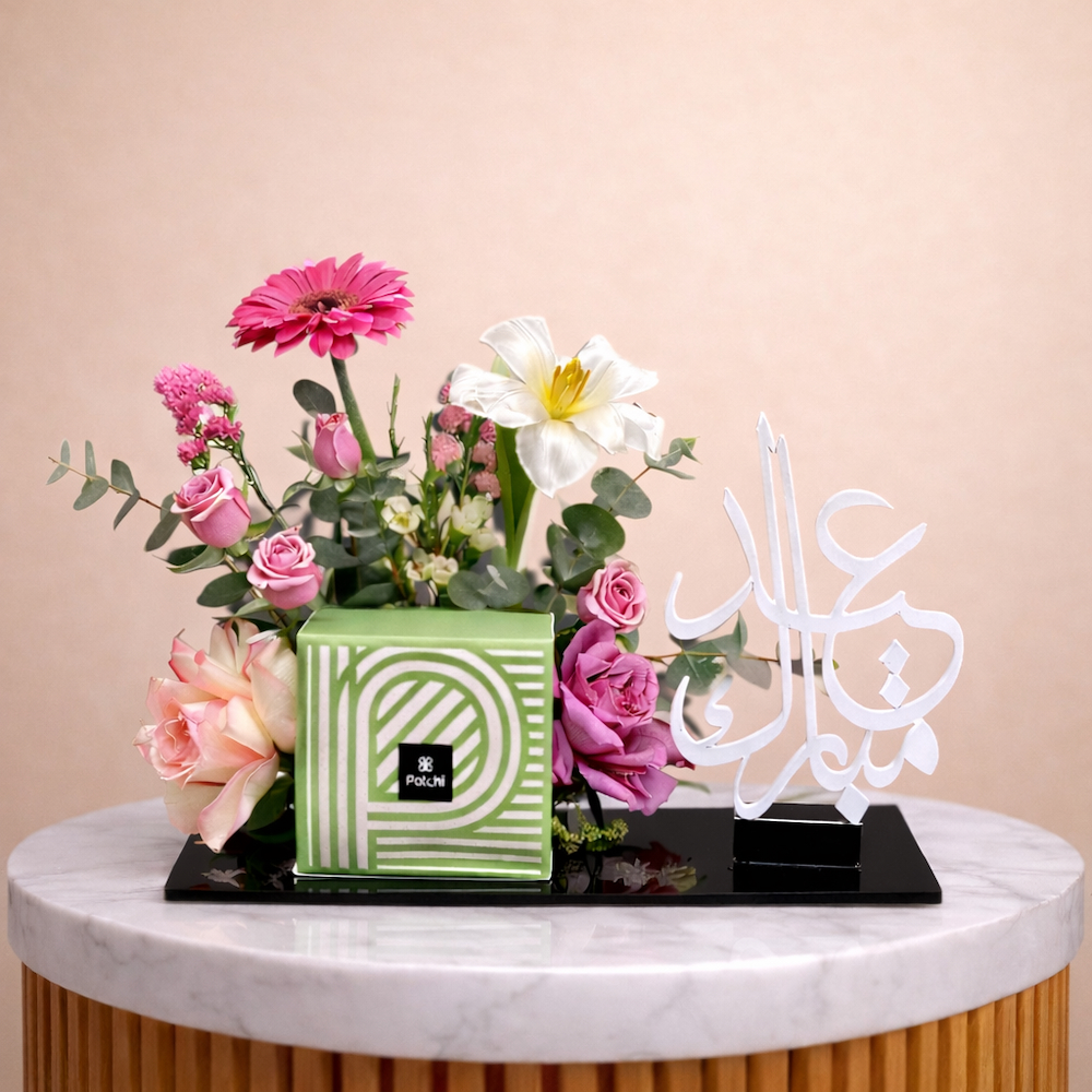 باقة تحتوي على زهور الجوري، الجيربيرا والتوليب، مرتبة بشكل جميل في صينية. تأتي مع شوكولاتة باتشي.