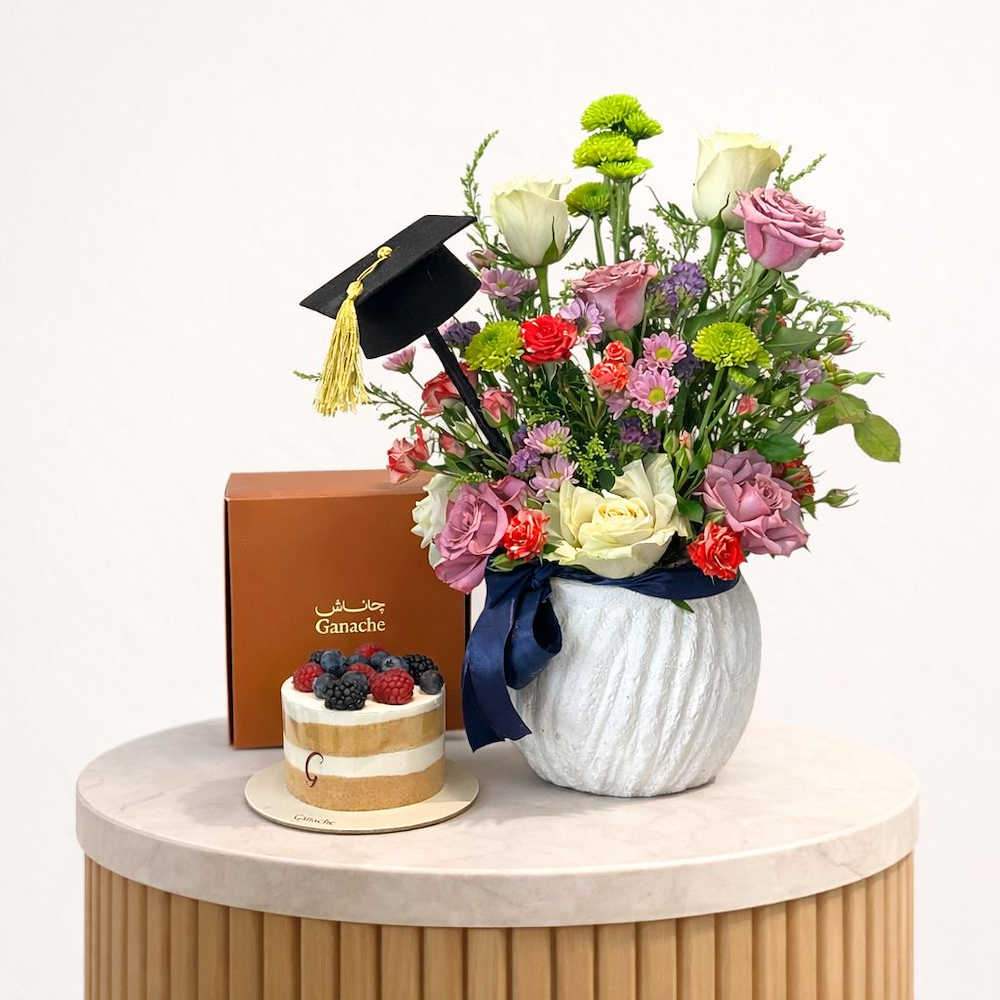 باقة يد من زهور الجوري، البيبي جوري والهايدرينجا مع كيكة توت من جاناش.