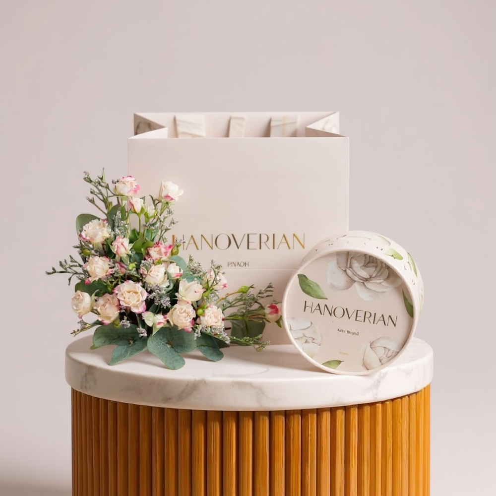 باقة تحتوي على البيبي جوري الوردي، مرتبة بشكل جميل في كيس مع علبة شوكولاتة من هانوفيريان.