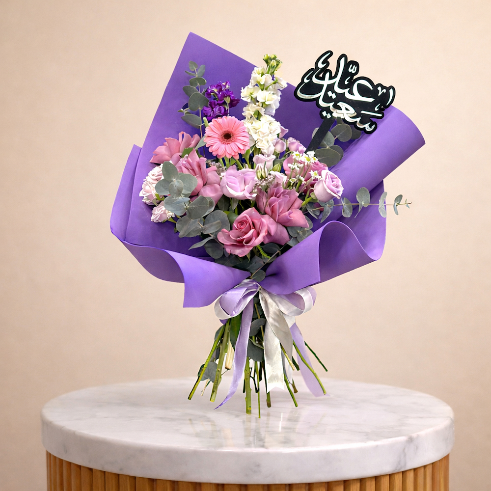 باقة يد مرتبة بشكل جميل بزهور بأجود أنواع زهور الجوري، البيبي جوري والدلفينيوم.