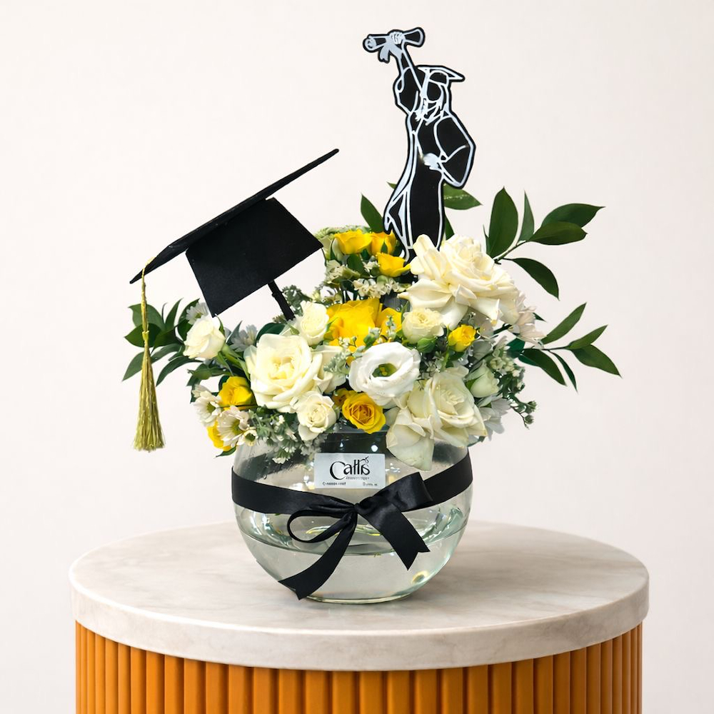 فازة التخرج الأنيقة تتميز بأزهار الجوري مع تغريسة التخرج.