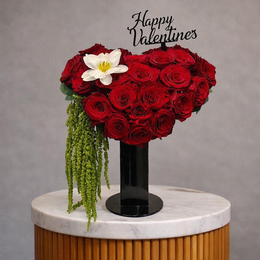 باقة تحتوي على زهور الجوري، البيبي جوري، الليلي، الألستروميريا والكريز، مرتبة بشكل جميل مع قبعة تخرج.