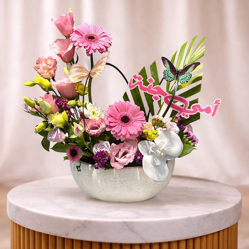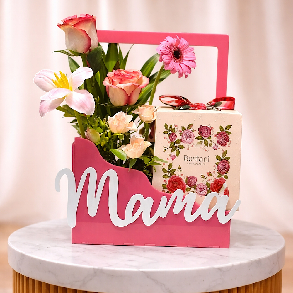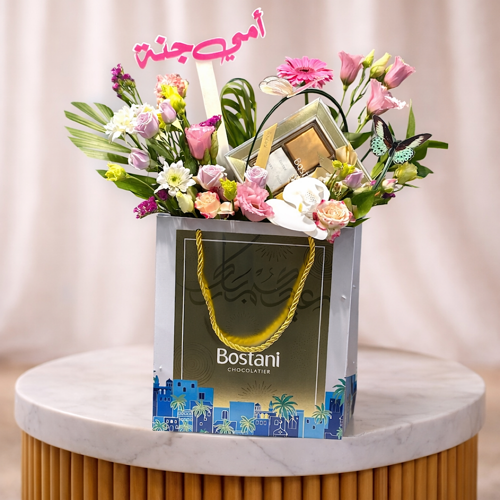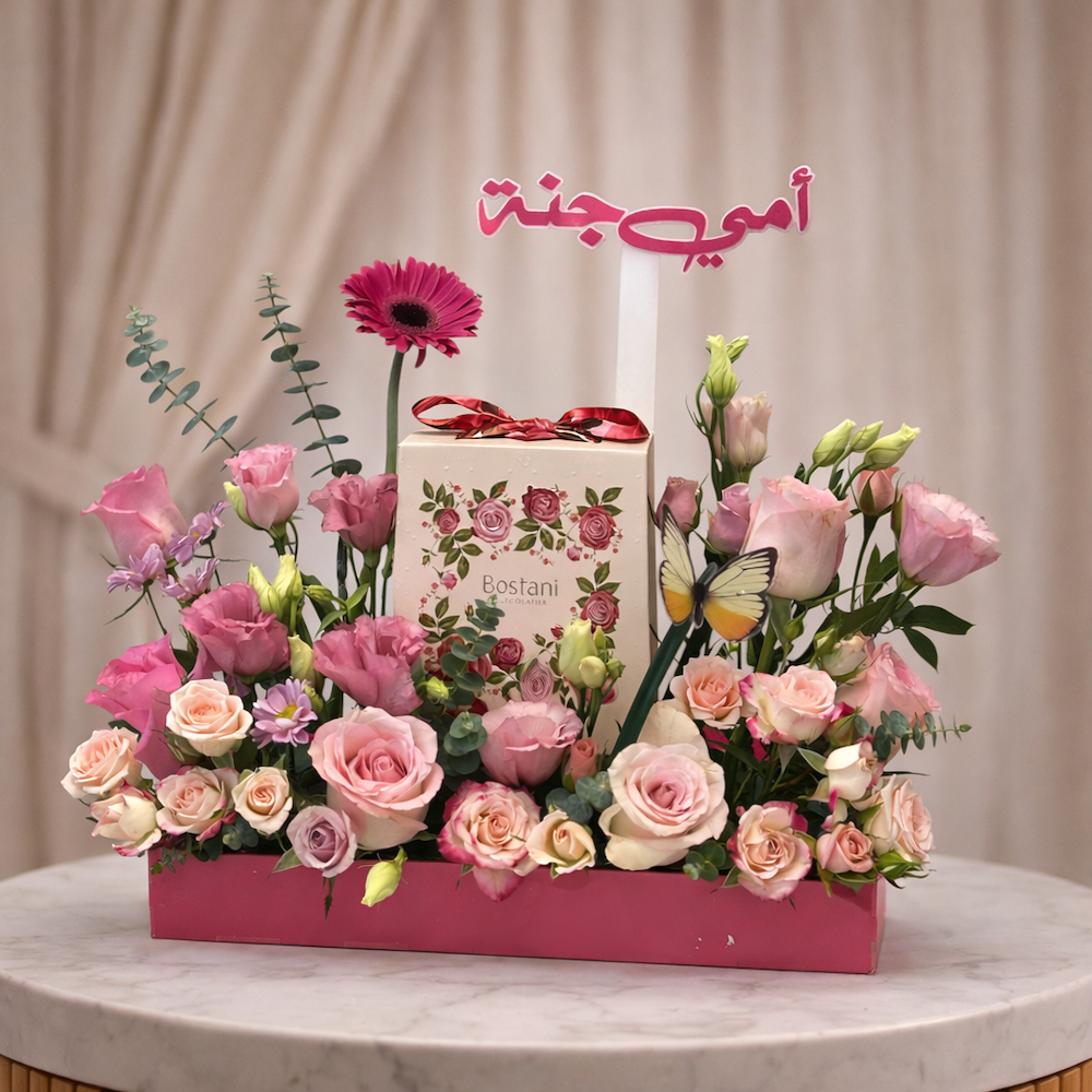 موضوع داخل وعاء فاخر بلون هادئ يوضع على طاولة بتصميم أنيق، مما يجعله قطعة مثالية للهدية في المناسبات الخاصة، خاصة للأم مزود بعبارة “أمي جنة” بتصميم جذاب، ليكون خيارًا مثاليًا لهدايا الأم ويعبر عن أصدق المشاعر بطريقة راقية ومميزة. كما يتضمن علبة شوكولاتة فاخرة بتغليف مزخرف بالورود، مما يجعل الهدية متكاملة بين الأناقة والطعم اللذيذ.