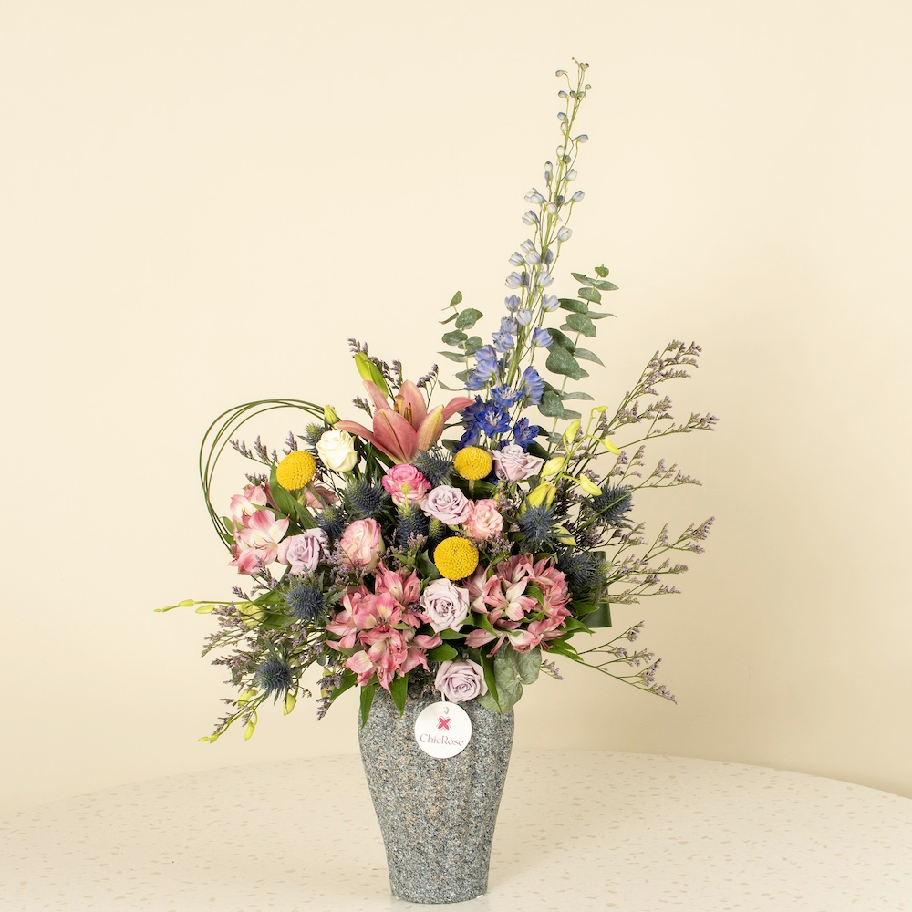 فازة مليئة بأزهار الكازابلانكا، السترومريا والبيبي روز الفاخرة بألوان رائعة، خيار مثالي لإهداء يفيض بالأناقة.