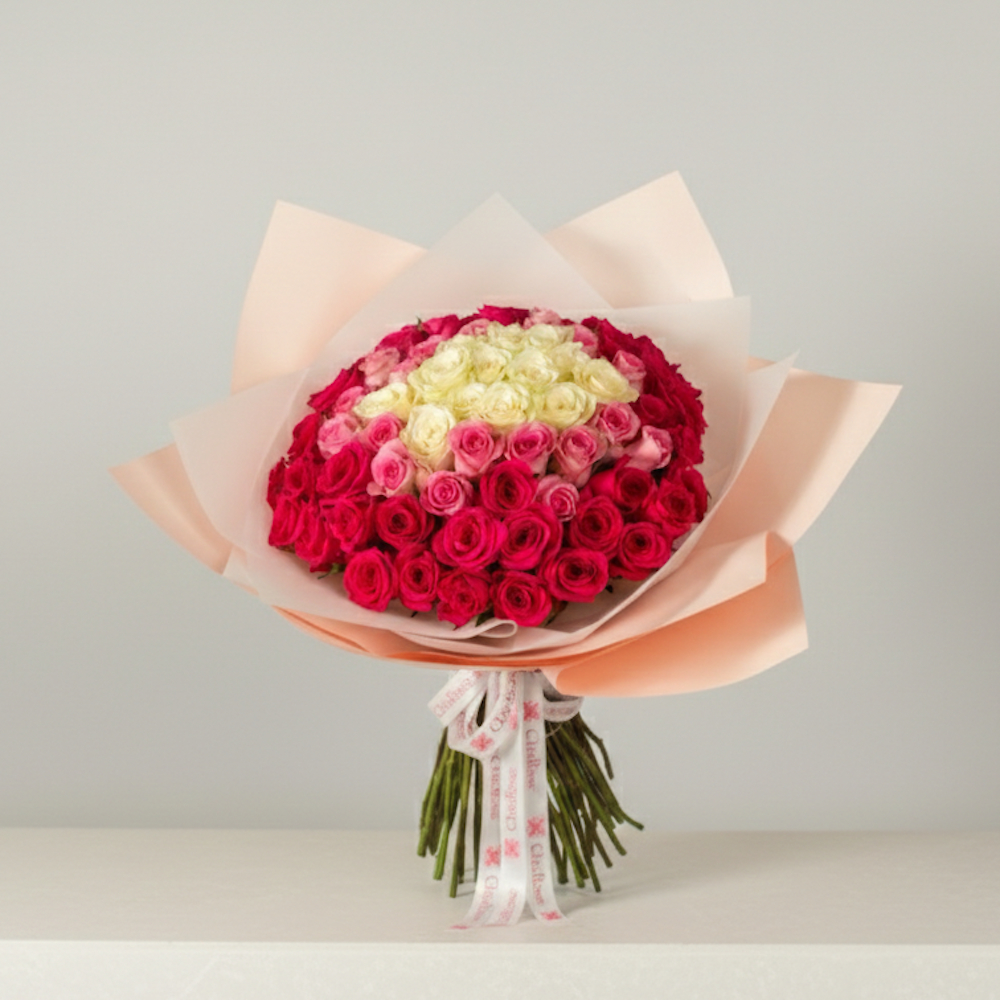 باقة مميزة من الروز الوردي والأبيض، منسقة بتصميم جميل وأنيقة، لتكون الخيار المثالي للمناسبات الخاصة.