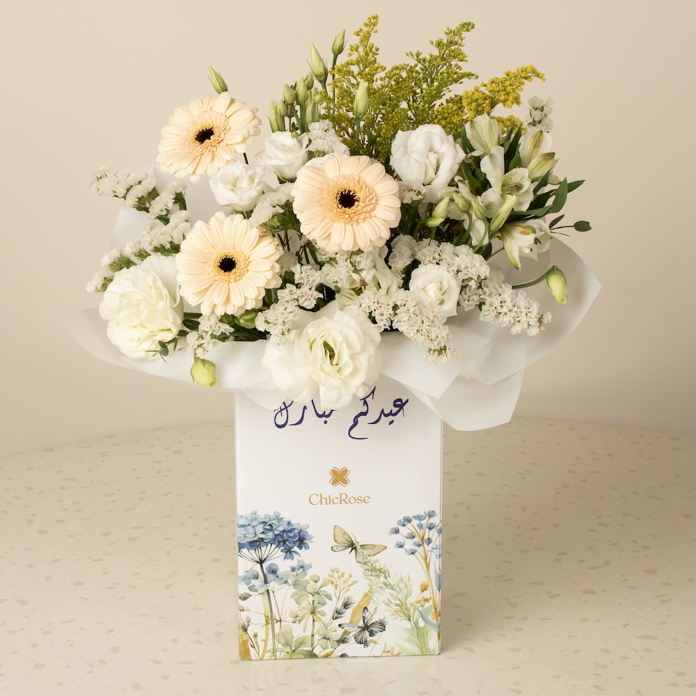 بوكس فاخر يضم الجربيرا، الليسانتوس والألستروميريا مع لمسات من الستاتس بداخل بوكس مصمم خصيصًا للعيد.