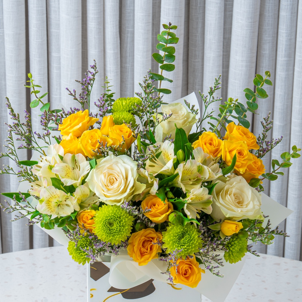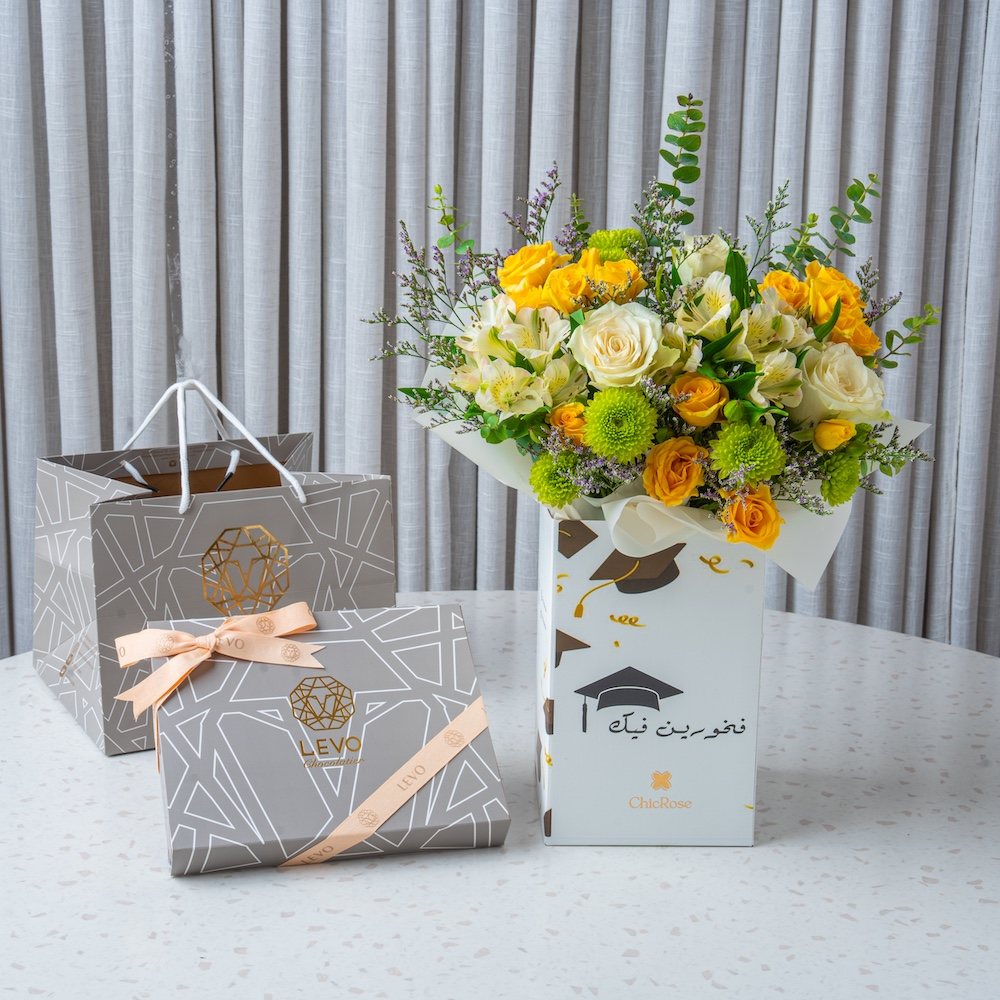 احتفلوا بالتخرج مع باقة زهور فاخرة بتنسيق أنيق من الجوري، الألستروميريا والكريز، تعبر عن الفخر والإنجاز وتكون هديتكم المثالية للخريجين والخريجات. تأتي مع علبة شوكولاتة من ليفو.
