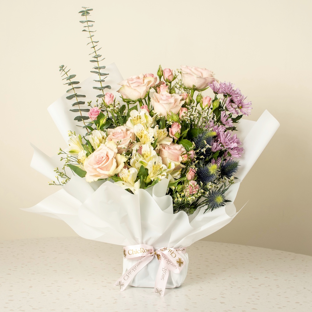 باقة أنيقة تجمع بين أزهار الجوري والسترومريا، مغلفة بتغليف أبيض فاخر يبرز جمالها الراقي.