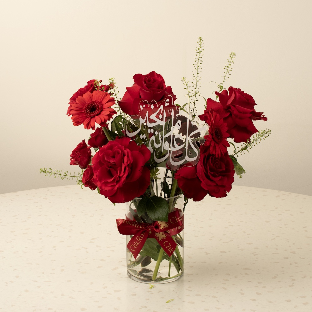 فازة بعبارة "كل عام وأنتم بخير" تنسيق فاخر بدرجات الأحمر يضم الجوري والبيبي روز مع الجاربيرا ولمسات أنيقة.