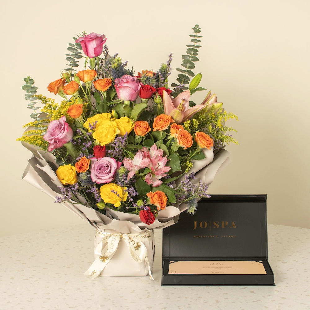 باقة ملونة تجمع بين الورود الصفراء، الحمراء، الوردية، والبرتقالية، مغلفة بتغليف رمادي مميز، مع بوكس إهداء جو سبا.