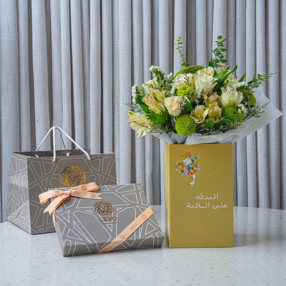 حقيبة مليئة بأزهار الجوري والسترومريا مع شوكولاتة ليڤو لتهنئة أنيقة وبسيطة.
