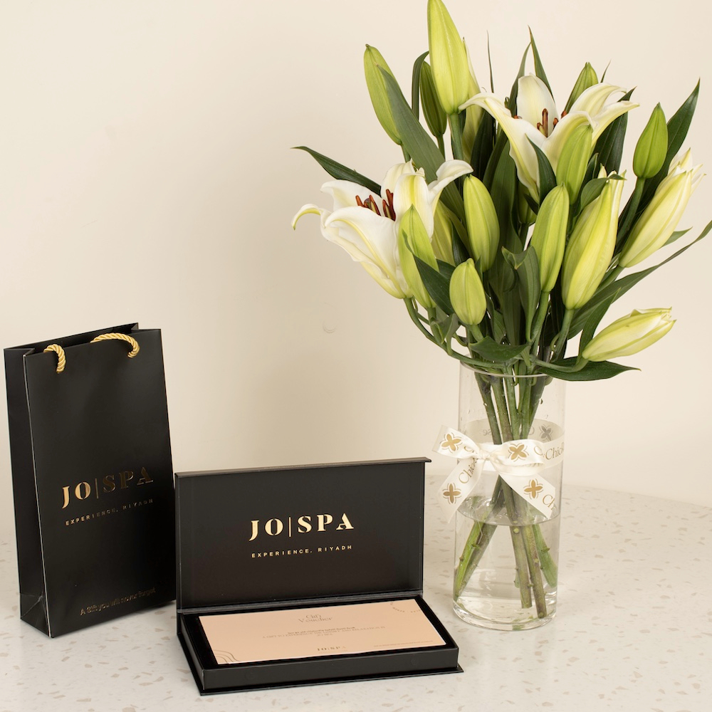 فازة متوسطة الحجم بتنسيق راقٍ من ليليوم أبيض مع بطاقة إهداء من جو سبا، تضيف لمسة نقاء وأناقة خاصة على أي مناسبة.