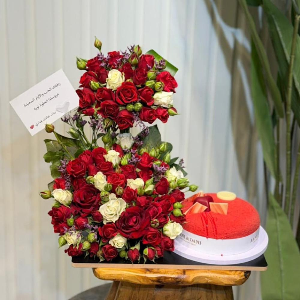 صينية مليئة بأزهار البيبي روز مع كيكة من اني وداني.