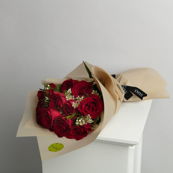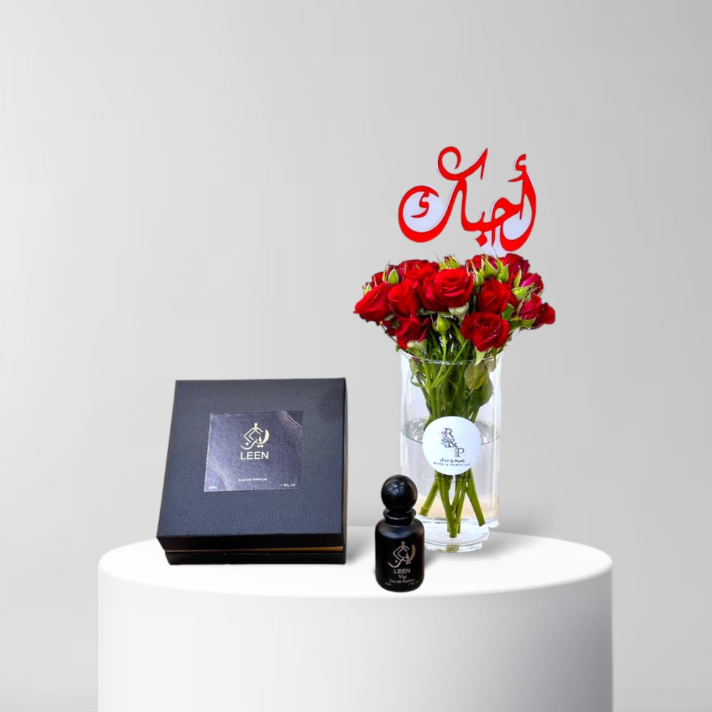فازة شفافة تحتوي على الجوري باللون الأحمر وزهور الجبسوفيلا.